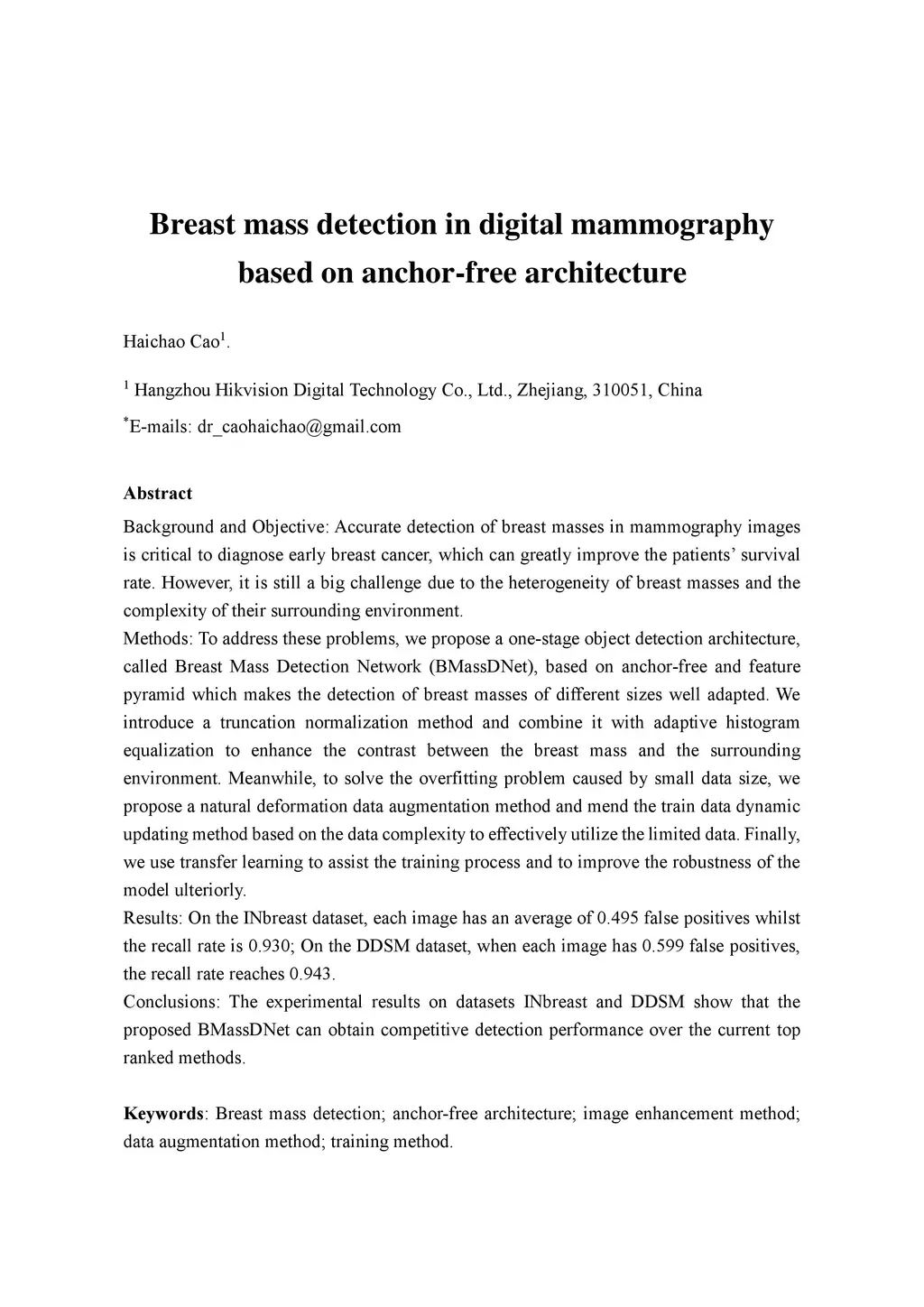Breast mass detection in digital mammography based on anchor-free