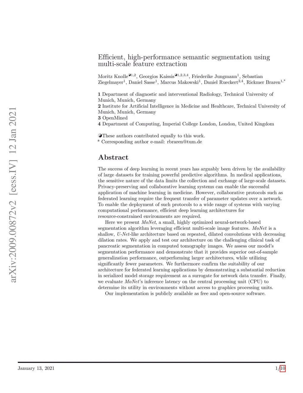 For artificial intelligence-based image analysis methods to reach clinical applicability, the development of high-performance algorithms is crucial. For example, existent segmentation algorithms based on natural images are neither efficient in their parameter use nor optimized for medical imaging. Here we present MoNet, a highly optimized neural-network-based pancreatic segmentation algorithm focused on achieving high performance by efficient multi-scale image feature utilization.
