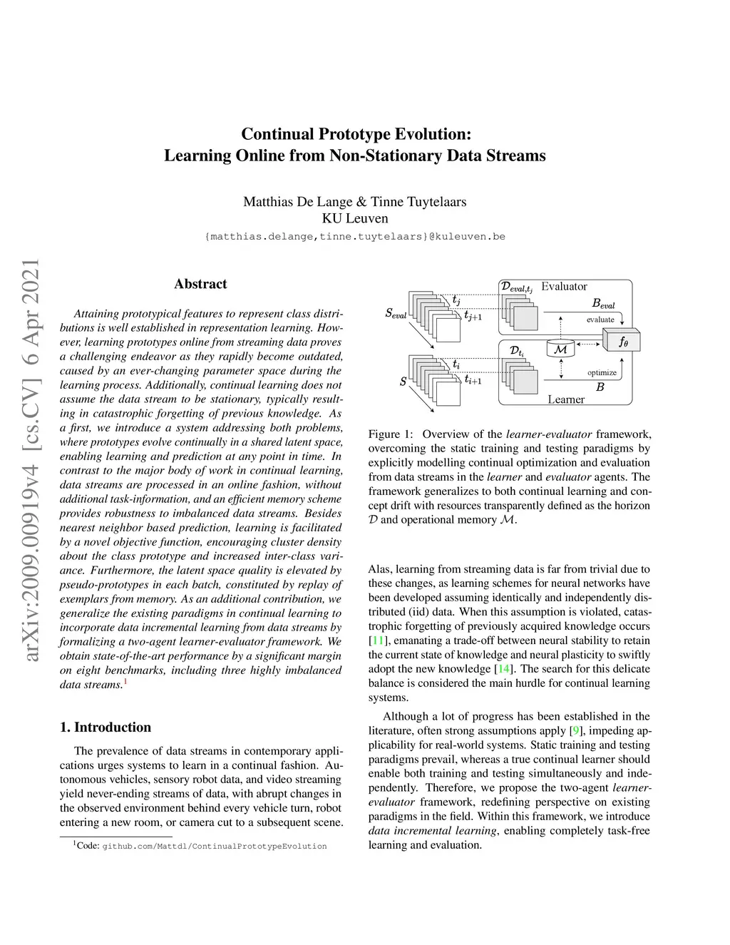 Attaining prototypical features to represent class distributions is well established in representation learning. However, learning prototypes online from streaming data proves a challenging endeavor as they rapidly become outdated, caused by an ever-changing parameter space during the learning process. Additionally, continual learning does not assume the data stream to be stationary, typically resulting in catastrophic forgetting of previous knowledge. As a first, we introduce a system addressing both problems, where prototypes evolve continually in a shared latent space, enabling learning and prediction at any point in time. In contrast to the major body of work in continual learning, data streams are processed in an online fashion, without additional task-information, and an efficient memory scheme provides robustness to imbalanced data streams. Besides nearest neighbor based prediction, learning is facilitated by a novel objective function, encouraging cluster density about the class prototype and increased inter-class variance. Furthermore, the latent space quality is elevated by pseudo-prototypes in each batch, constituted by replay of exemplars from memory. As an additional contribution, we generalize the existing paradigms in continual learning to incorporate data incremental learning from data streams by formalizing a two-agent learner-evaluator framework. We obtain state-of-the-art performance by a significant margin on eight benchmarks, including three highly imbalanced data streams.