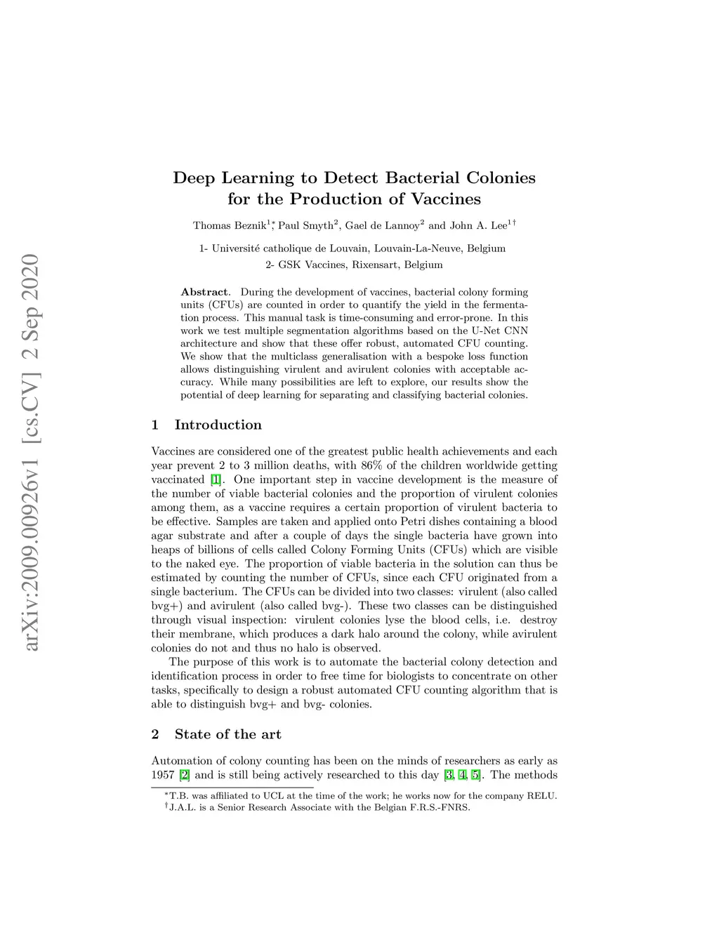 During the development of vaccines, bacterial colony forming units (CFUs) are counted in order to quantify the yield in the fermentation process. This manual task is time-consuming and error-prone. In this work we test multiple segmentation algorithms based on the U-Net CNN architecture and show that these offer robust, automated CFU counting. We show that the multiclass generalisation with a bespoke loss function allows distinguishing virulent and avirulent colonies with acceptable accuracy. While many possibilities are left to explore, our results show the potential of deep learning for separating and classifying bacterial colonies.