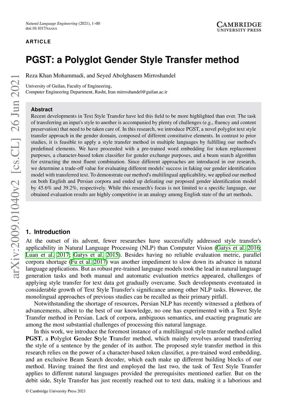 Recent developments in Text Style Transfer have led this field to be more highlighted than ever. The task of transferring an input's style to another is accompanied by plenty of challenges (e.g., fluency and content preservation) that need to be taken care of. In this research, we introduce PGST, a novel polyglot text style transfer approach in the gender domain, composed of different constitutive elements. In contrast to prior studies, it is feasible to apply a style transfer method in multiple languages by fulfilling our method's predefined elements. We have proceeded with a pre-trained word embedding for token replacement purposes, a character-based token classifier for gender exchange purposes, and a beam search algorithm for extracting the most fluent combination. Since different approaches are introduced in our research, we determine a trade-off value for evaluating different models' success in faking our gender identification model with transferred text. To demonstrate our method's multilingual applicability, we applied our method on both English and Persian corpora and ended up defeating our proposed gender identification model by 45.6% and 39.2%, respectively. While this research's focus is not limited to a specific language, our obtained evaluation results are highly competitive in an analogy among English state of the art methods.