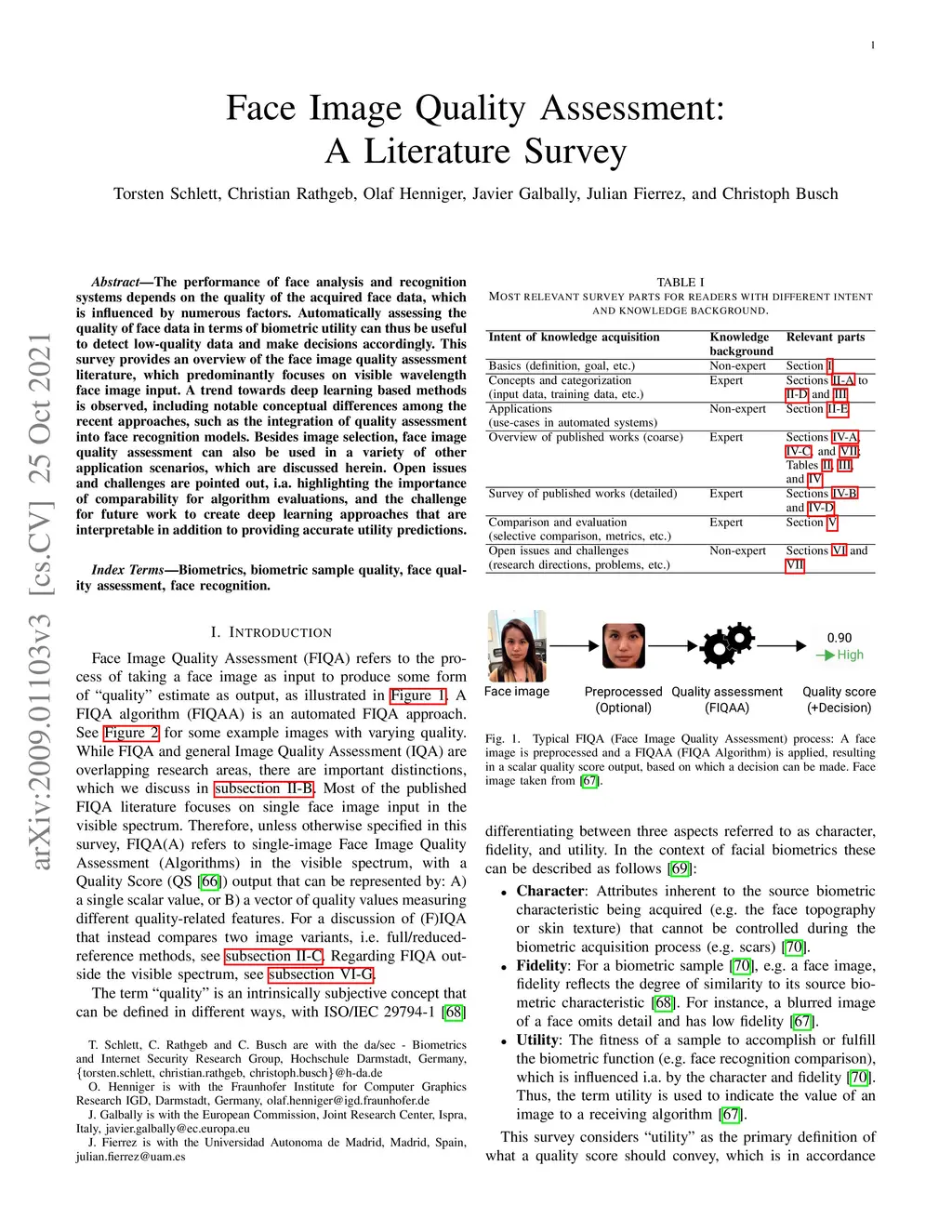 The performance of face analysis and recognition systems depends on the quality of the acquired face data, which is influenced by numerous factors. Automatically assessing the quality of face data in terms of biometric utility can thus be useful to filter out low quality data. This survey provides an overview of the face quality assessment literature in the framework of face biometrics, with a focus on face recognition based on visible wavelength face images as opposed to e.g. depth or infrared quality assessment. A trend towards deep learning based methods is observed, including notable conceptual differences among the recent approaches. Besides image selection, face image quality assessment can also be used in a variety of other application scenarios, which are discussed herein. Open issues and challenges are pointed out, i.a. highlighting the importance of comparability for algorithm evaluations, and the challenge for future work to create deep learning approaches that are interpretable in addition to providing accurate utility predictions.