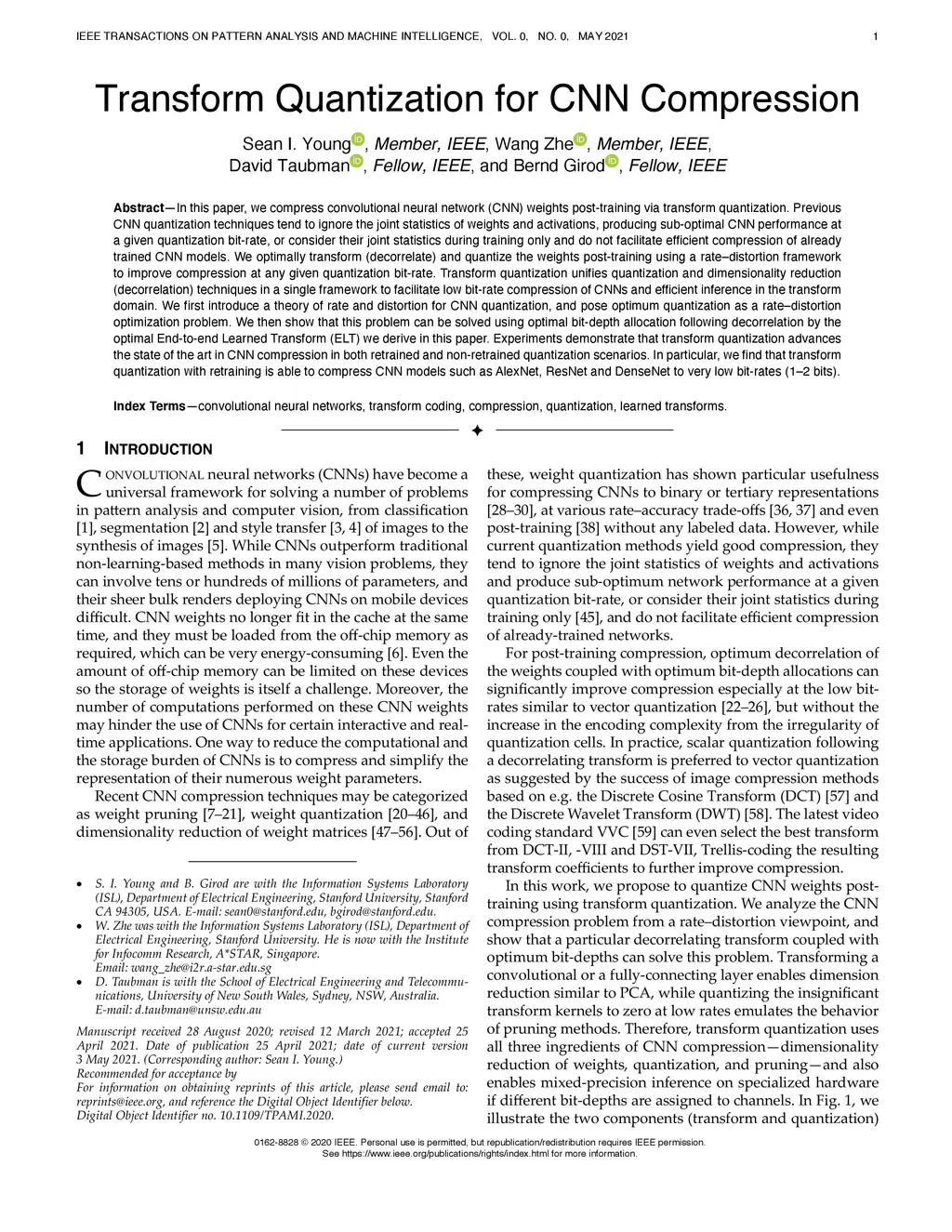 In this paper, we compress convolutional neural network (CNN) weights post-training via transform quantization. Previous CNN quantization techniques tend to ignore the joint statistics of weights and activations, producing sub-optimal CNN performance at a given quantization bit-rate, or consider their joint statistics during training only and do not facilitate efficient compression of already trained CNN models. We optimally transform (decorrelate) and quantize the weights post-training using a rate-distortion framework to improve compression at any given quantization bit-rate. Transform quantization unifies quantization and dimensionality reduction (decorrelation) techniques in a single framework to facilitate low bit-rate compression of CNNs and efficient inference in the transform domain. We first introduce a theory of rate and distortion for CNN quantization, and pose optimum quantization as a rate-distortion optimization problem. We then show that this problem can be solved using optimal bit-depth allocation following decorrelation by the optimal End-to-end Learned Transform (ELT) we derive in this paper. Experiments demonstrate that transform quantization advances the state of the art in CNN compression in both retrained and non-retrained quantization scenarios. In particular, we find that transform quantization with retraining is able to compress CNN models such as AlexNet, ResNet and DenseNet to very low bit-rates (1-2 bits).