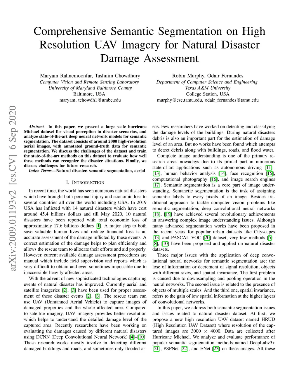 In this paper, we present a large-scale hurricane Michael dataset for visual perception in disaster scenarios, and analyze state-of-the-art deep neural network models for semantic segmentation. The dataset consists of around 2000 high-resolution aerial images, with annotated ground-truth data for semantic segmentation. We discuss the challenges of the dataset and train the state-of-the-art methods on this dataset to evaluate how well these methods can recognize the disaster situations. Finally, we discuss challenges for future research.