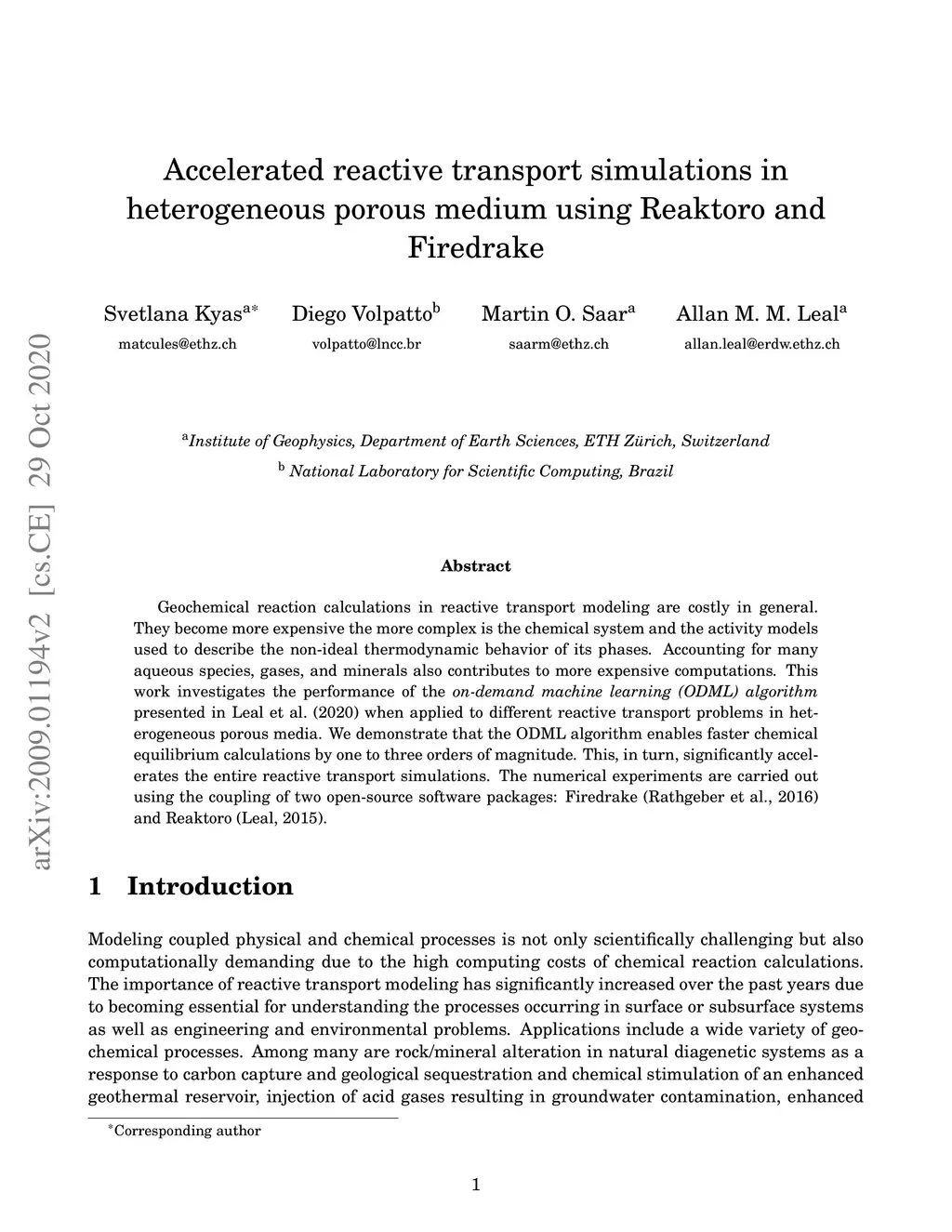 This work investigates the performance of the on-demand machine learning (ODML) algorithm introduced in Leal et al. (2020) when applied to different reactive transport problems in heterogeneous porous media. ODML was devised to accelerate the computationally expensive geochemical reaction calculations in reactive transport simulations. We demonstrate that the ODML algorithm speeds up these calculations by one to three orders of magnitude. Such acceleration, in turn, significantly accelerates the entire reactive transport simulation. The numerical experiments are performed by implementing the coupling of two open-source software packages: Reaktoro (Leal, 2015) and Firedrake (Rathgeber et al., 2016).
