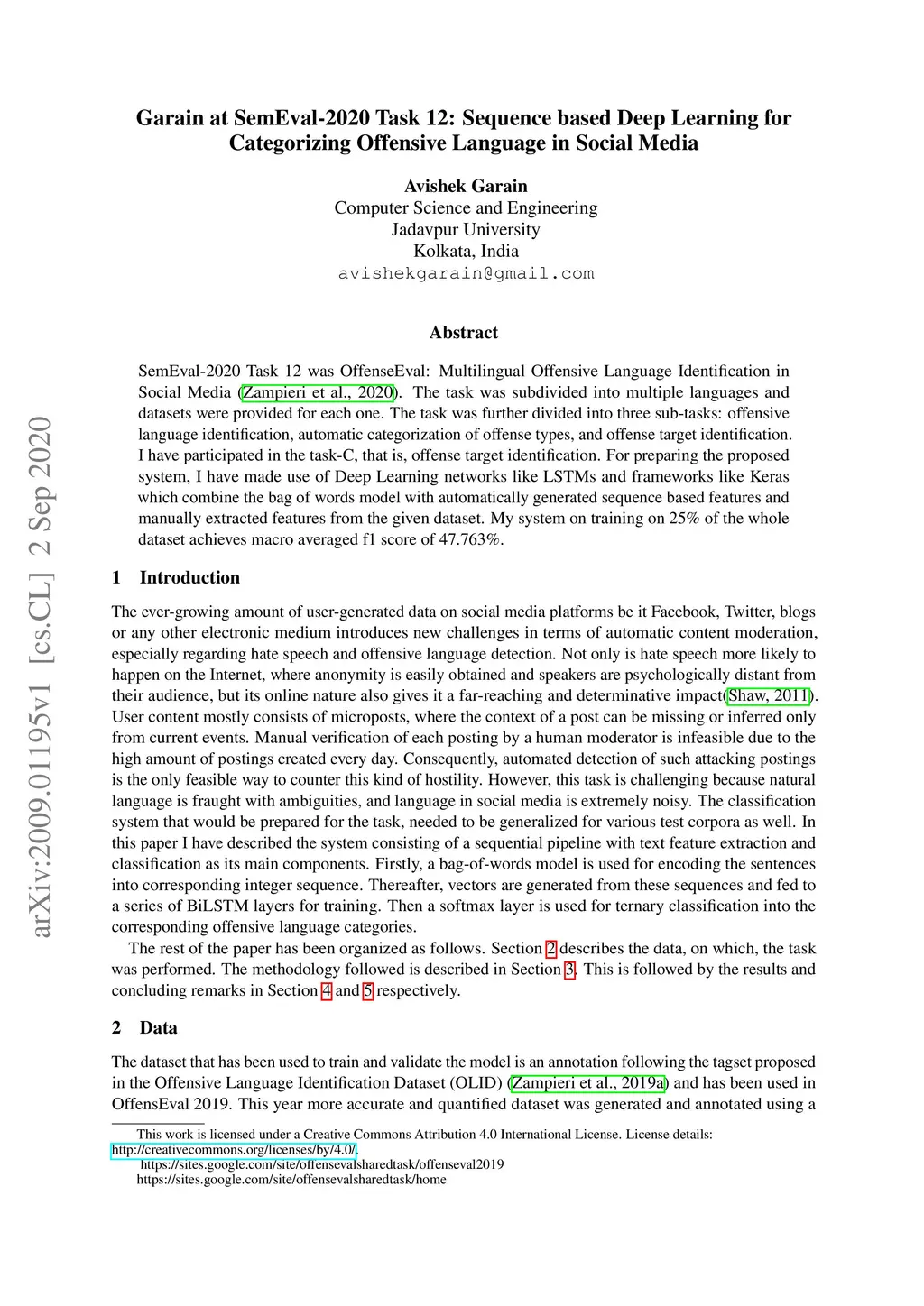 Garain at SemEval-2020 Task 12: Sequence based Deep Learning for