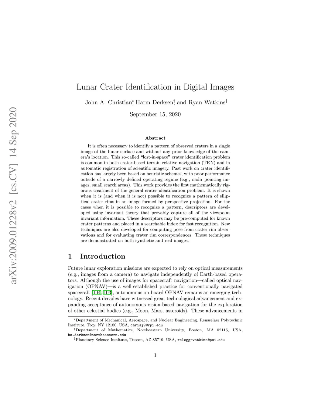 It is often necessary to identify a pattern of observed craters in a single image of the lunar surface and without any prior knowledge of the camera's location. This so-called "lost-in-space" crater identification problem is common in both crater-based terrain relative navigation (TRN) and in automatic registration of scientific imagery. Past work on crater identification has largely been based on heuristic schemes, with poor performance outside of a narrowly defined operating regime (e.g., nadir pointing images, small search areas). This work provides the first mathematically rigorous treatment of the general crater identification problem. It is shown when it is (and when it is not) possible to recognize a pattern of elliptical crater rims in an image formed by perspective projection. For the cases when it is possible to recognize a pattern, descriptors are developed using invariant theory that provably capture all of the viewpoint invariant information. These descriptors may be pre-computed for known crater patterns and placed in a searchable index for fast recognition. New techniques are also developed for computing pose from crater rim observations and for evaluating crater rim correspondences. These techniques are demonstrated on both synthetic and real images.
