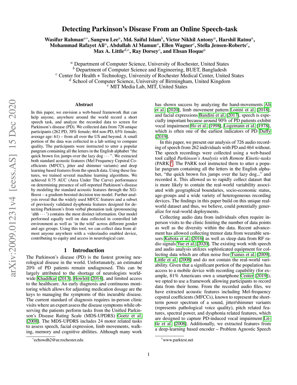 In this paper, we envision a web-based framework that can help anyone, anywhere around the world record a short speech task, and analyze the recorded data to screen for Parkinson's disease (PD). We collected data from 726 unique participants (262 PD, 38% female; 464 non-PD, 65% female; average age: 61) -- from all over the US and beyond. A small portion of the data was collected in a lab setting to compare quality. The participants were instructed to utter a popular pangram containing all the letters in the English alphabet "the quick brown fox jumps over the lazy dog..". We extracted both standard acoustic features (Mel Frequency Cepstral Coefficients (MFCC), jitter and shimmer variants) and deep learning based features from the speech data. Using these features, we trained several machine learning algorithms. We achieved 0.75 AUC (Area Under The Curve) performance on determining presence of self-reported Parkinson's disease by modeling the standard acoustic features through the XGBoost -- a gradient-boosted decision tree model. Further analysis reveal that the widely used MFCC features and a subset of previously validated dysphonia features designed for detecting Parkinson's from verbal phonation task (pronouncing áhh') contains the most distinct information. Our model performed equally well on data collected in controlled lab environment as well as ín the wild' across different gender and age groups. Using this tool, we can collect data from almost anyone anywhere with a video/audio enabled device, contributing to equity and access in neurological care.