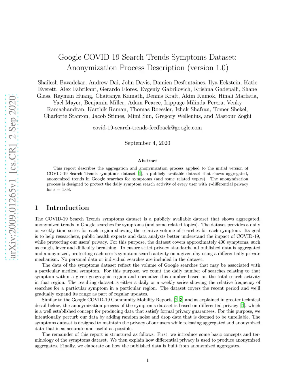 This report describes the aggregation and anonymization process applied to the initial version of COVID-19 Search Trends symptoms dataset (published at https://goo.gle/covid19symptomdataset on September 2, 2020), a publicly available dataset that shows aggregated, anonymized trends in Google searches for symptoms (and some related topics). The anonymization process is designed to protect the daily symptom search activity of every user with -differential privacy for = 1.68.
