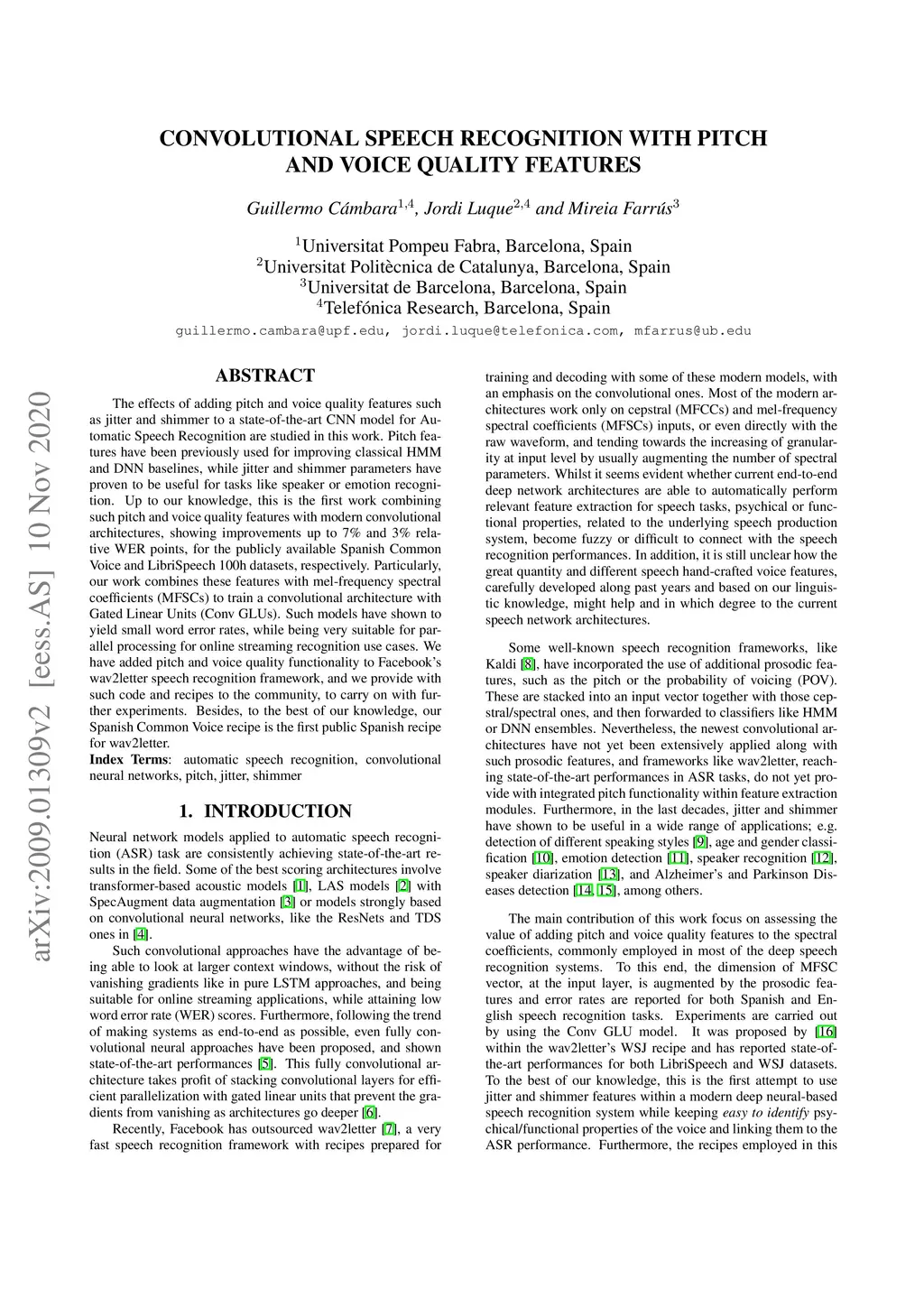 The effects of adding pitch and voice quality features such as jitter and shimmer to a state-of-the-art CNN model for Automatic Speech Recognition are studied in this work. Pitch features have been previously used for improving classical HMM and DNN baselines, while jitter and shimmer parameters have proven to be useful for tasks like speaker or emotion recognition. Up to our knowledge, this is the first work combining such pitch and voice quality features with modern convolutional architectures, showing improvements up to 7% and 3% relative WER points, for the publicly available Spanish Common Voice and LibriSpeech 100h datasets, respectively. Particularly, our work combines these features with mel-frequency spectral coefficients (MFSCs) to train a convolutional architecture with Gated Linear Units (Conv GLUs). Such models have shown to yield small word error rates, while being very suitable for parallel processing for online streaming recognition use cases. We have added pitch and voice quality functionality to Facebook's wav2letter speech recognition framework, and we provide with such code and recipes to the community, to carry on with further experiments. Besides, to the best of our knowledge, our Spanish Common Voice recipe is the first public Spanish recipe for wav2letter.