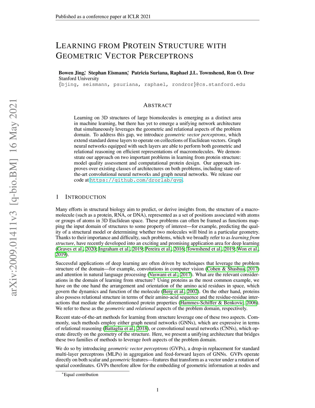 Learning on 3D structures of large biomolecules is emerging as a distinct area in machine learning, but there has yet to emerge a unifying network architecture that simultaneously leverages the graph-structured and geometric aspects of the problem domain. To address this gap, we introduce geometric vector perceptrons, which extend standard dense layers to operate on collections of Euclidean vectors. Graph neural networks equipped with such layers are able to perform both geometric and relational reasoning on efficient and natural representations of macromolecular structure. We demonstrate our approach on two important problems in learning from protein structure: model quality assessment and computational protein design. Our approach improves over existing classes of architectures, including state-of-the-art graph-based and voxel-based methods. We release our code at https://github.com/drorlab/gvp.