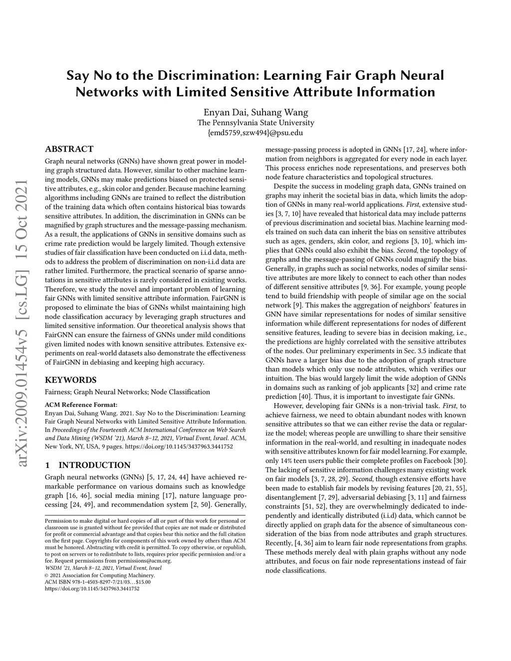 Graph neural networks (GNNs) have achieved state-of-the-art performance in modeling graphs. Despite its great success, as with many other models, GNNs have the risk to inherit the bias from the training data. In addition, the bias of GNN can be magnified by the graph structures and message-passing mechanism of GNNs. The risk of discrimination limits the adoption of GNNs in sensitive domains such as credit score estimation. Though extensive studies of fair classification have been conducted on i.i.d data, methods to address the problem of discrimination on non-i.i.d data are rather limited. Furthermore, the practical scenario of sparse annotations in sensitive attributes is rarely considered in existing works. Therefore, we study the novel and important problem of learning fair GNNs with limited sensitive information. We propose a novel framework called FairGNN, which is able to reduce the bias of GNNs and maintain high node classification accuracy by leveraging graph structured data and sensitive information. Theoretical analysis is conducted to show that FairGNN can ensure fairness under mild conditions given limited nodes with known sensitive attributes. Experiments on real-world datasets demonstrated the effectiveness of the proposed framework in eliminating discrimination while maintaining high node classification accuracy.