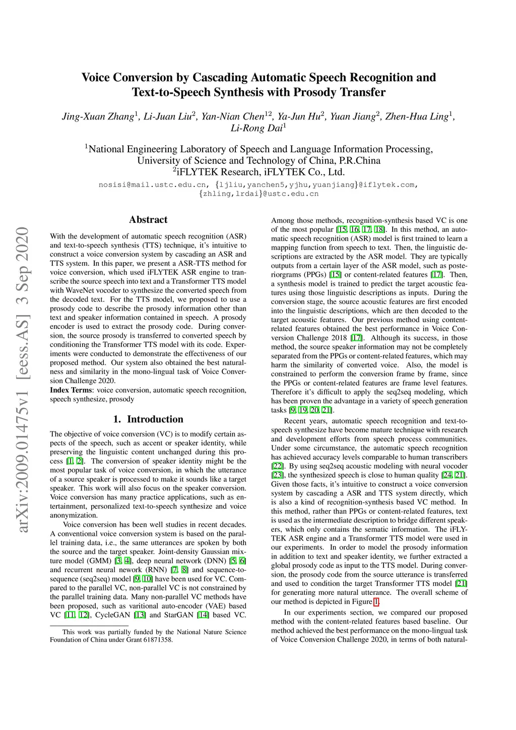 With the development of automatic speech recognition (ASR) and text-to-speech synthesis (TTS) technique, it's intuitive to construct a voice conversion system by cascading an ASR and TTS system. In this paper, we present a ASR-TTS method for voice conversion, which used iFLYTEK ASR engine to transcribe the source speech into text and a Transformer TTS model with WaveNet vocoder to synthesize the converted speech from the decoded text. For the TTS model, we proposed to use a prosody code to describe the prosody information other than text and speaker information contained in speech. A prosody encoder is used to extract the prosody code. During conversion, the source prosody is transferred to converted speech by conditioning the Transformer TTS model with its code. Experiments were conducted to demonstrate the effectiveness of our proposed method. Our system also obtained the best naturalness and similarity in the mono-lingual task of Voice Conversion Challenge 2020.