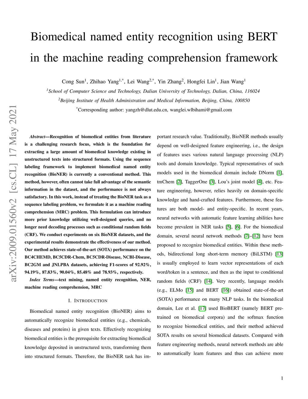 Biomedical named entity recognition using BERT in the machine reading