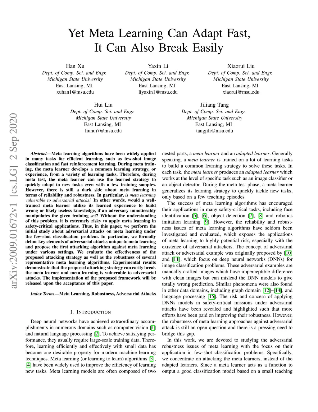 Yet Meta Learning Can Adapt Fast, It Can Also Break Easily