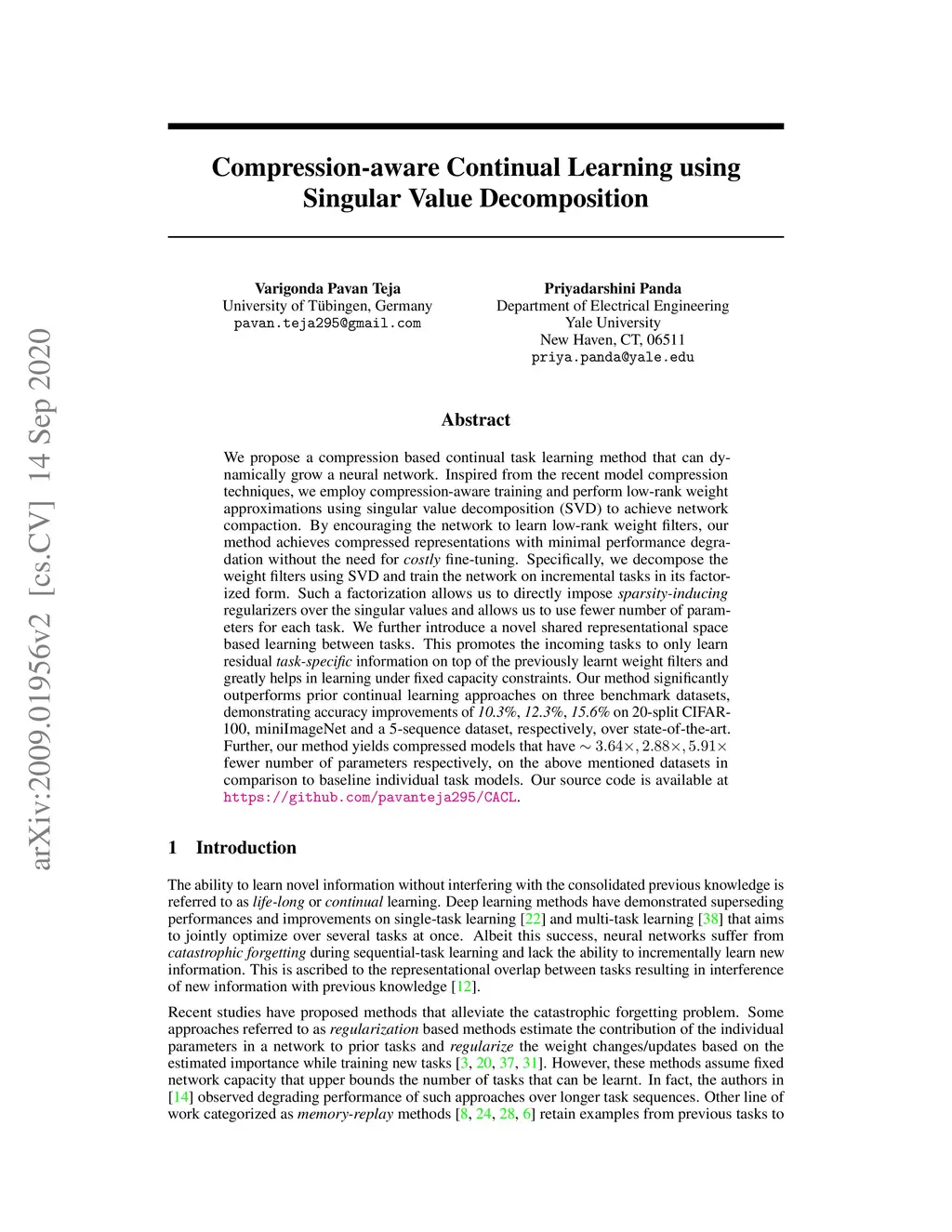 We propose a compression based continual task learning method that can dynamically grow a neural network. Inspired from the recent model compression techniques, we employ compression-aware training and perform low-rank weight approximations using singular value decomposition (SVD) to achieve network compaction. By encouraging the network to learn low-rank weight filters, our method achieves compressed representations with minimal performance degradation without the need for costly fine-tuning. Specifically, we decompose the weight filters using SVD and train the network on incremental tasks in its factorized form. Such a factorization allows us to directly impose sparsity-inducing regularizers over the singular values and allows us to use fewer number of parameters for each task. We further introduce a novel shared representational space based learning between tasks. This promotes the incoming tasks to only learn residual task-specific information on top of the previously learnt weight filters and greatly helps in learning under fixed capacity constraints. Our method significantly outperforms prior continual learning approaches on three benchmark datasets, demonstrating accuracy improvements of 10.3%, 12.3%, 15.6% on 20-split CIFAR-100, miniImageNet and a 5-sequence dataset, respectively, over state-of-the-art. Further, our method yields compressed models that have ~3.64x, 2.88x, 5.91x fewer number of parameters respectively, on the above mentioned datasets in comparison to baseline individual task models. Our source code is available at https://github.com/pavanteja295/CACL.