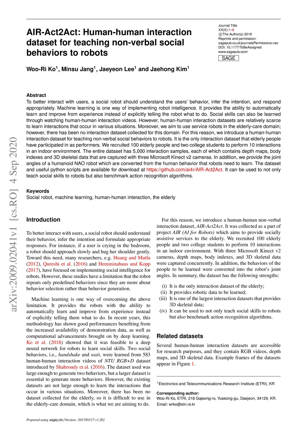 AIR-Act2Act: Human-human interaction dataset for teaching non-verbal