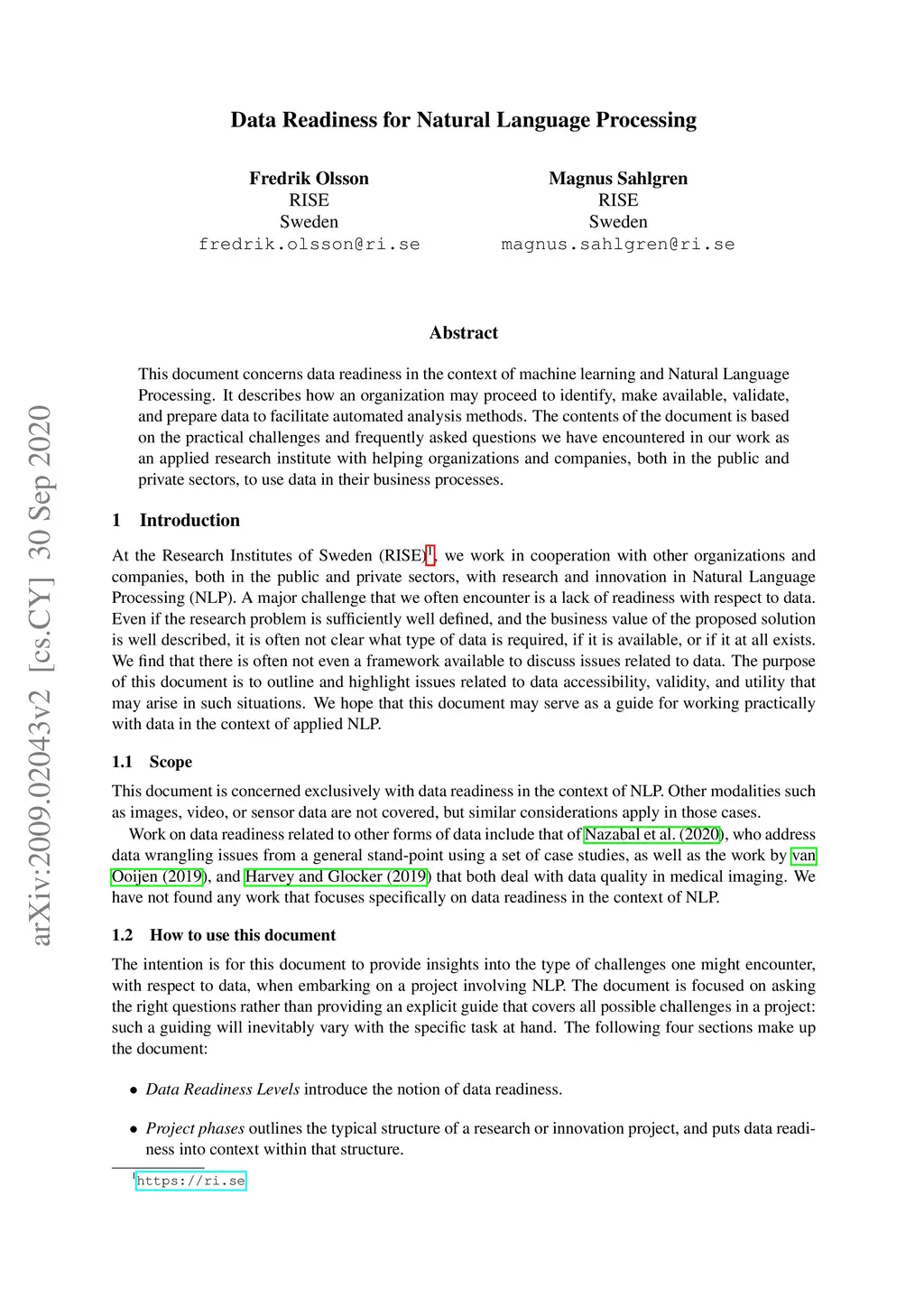 This document concerns data readiness in the context of machine learning and Natural Language Processing. It describes how an organization may proceed to identify, make available, validate, and prepare data to facilitate automated analysis methods. The contents of the document is based on the practical challenges and frequently asked questions we have encountered in our work as an applied research institute with helping organizations and companies, both in the public and private sectors, to use data in their business processes.