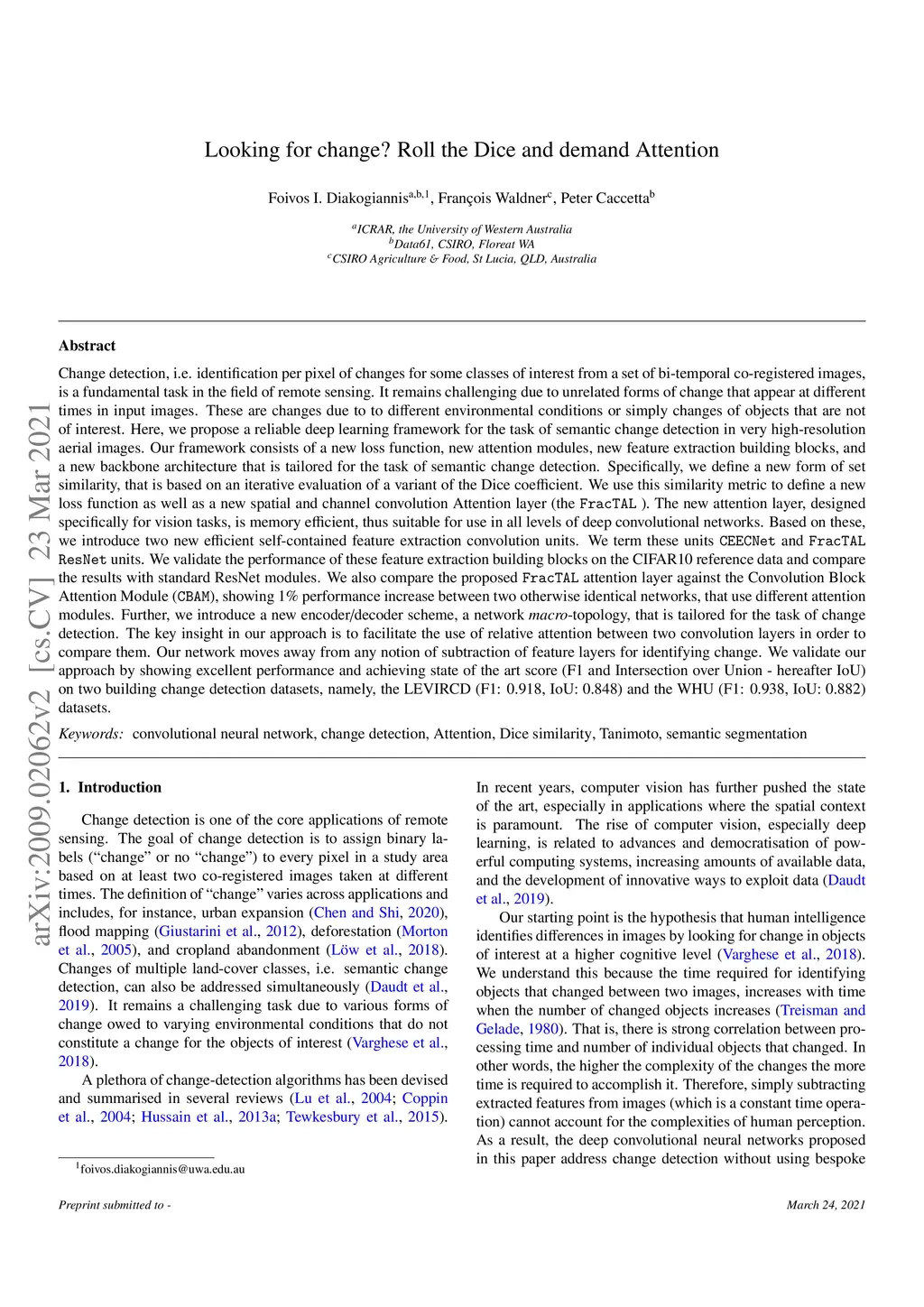 Change detection, i.e. identification per pixel of changes for some classes of interest from a set of bi-temporal co-registered images, is a fundamental task in the field of remote sensing. It remains challenging due to unrelated forms of change that appear at different times in input images. Here, we propose a reliable deep learning framework for the task of semantic change detection in very high-resolution aerial images. Our framework consists of a new loss function, new attention modules, new feature extraction building blocks, and a new backbone architecture that is tailored for the task of semantic change detection. Specifically, we define a new form of set similarity, that is based on an iterative evaluation of a variant of the Dice coefficient. We use this similarity metric to define a new loss function as well as a new spatial and channel convolution Attention layer (the FracTAL). The new attention layer, designed specifically for vision tasks, is memory efficient, thus suitable for use in all levels of deep convolutional networks. Based on these, we introduce two new efficient self-contained feature extraction convolution units. We validate the performance of these feature extraction building blocks on the CIFAR10 reference data and compare the results with standard ResNet modules. Further, we introduce a new encoder/decoder scheme, a network macro-topology, that is tailored for the task of change detection. Our network moves away from any notion of subtraction of feature layers for identifying change. We validate our approach by showing excellent performance and achieving state of the art score (F1 and Intersection over Union-hereafter IoU) on two building change detection datasets, namely, the LEVIRCD (F1: 0.918, IoU: 0.848) and the WHU (F1: 0.938, IoU: 0.882) datasets.