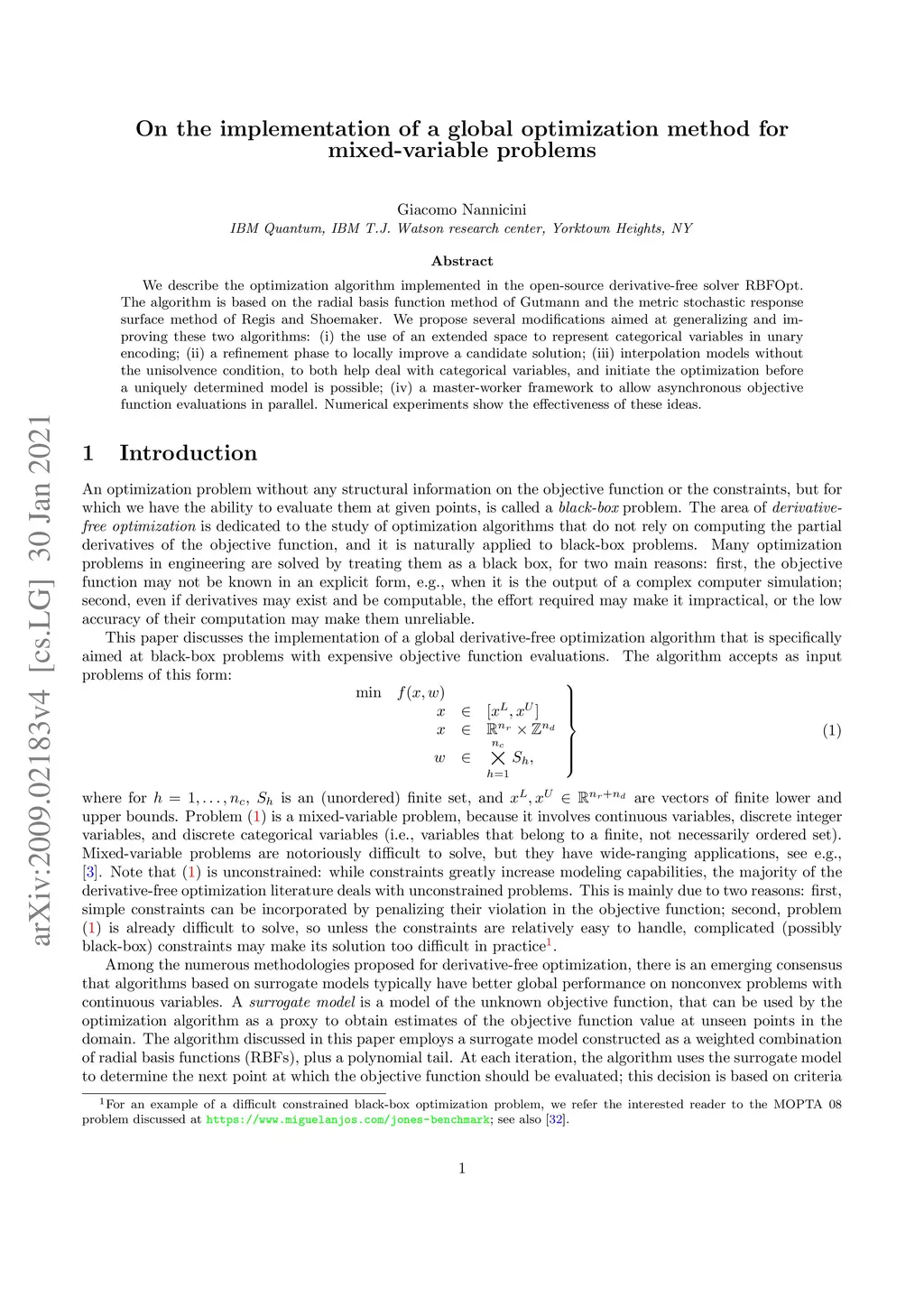 We describe the optimization algorithm implemented in the open-source derivative-free solver RBFOpt. The algorithm is based on the radial basis function method of Gutmann and the metric stochastic response surface method of Regis and Shoemaker. We propose several modifications aimed at generalizing and improving these two algorithms: (i) the use of an extended space to represent categorical variables in unary encoding; (ii) a refinement phase to locally improve a candidate solution; (iii) interpolation models without the unisolvence condition, to both help deal with categorical variables, and initiate the optimization before a uniquely determined model is possible; (iv) a master-worker framework to allow asynchronous objective function evaluations in parallel. Numerical experiments show the effectiveness of these ideas.