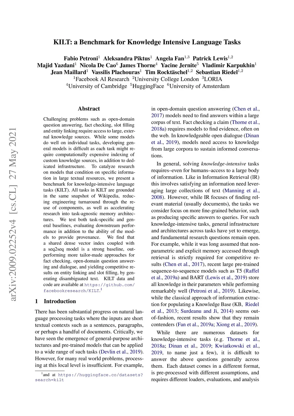 Challenging problems such as open-domain question answering, fact checking, slot filling and entity linking require access to large, external knowledge sources. While some models do well on individual tasks, developing general models is difficult as each task might require computationally expensive indexing of custom knowledge sources, in addition to dedicated infrastructure. To catalyze research on models that condition on specific information in large textual resources, we present a benchmark for knowledge-intensive language tasks (KILT). All tasks in KILT are grounded in the same snapshot of Wikipedia, reducing engineering turnaround through the re-use of components, as well as accelerating research into task-agnostic memory architectures. We test both task-specific and general baselines, evaluating downstream performance in addition to the ability of the models to provide provenance. We find that a shared dense vector index coupled with a seq2seq model is a strong baseline, outperforming more tailor-made approaches for fact checking, open-domain question answering and dialogue, and yielding competitive results on entity linking and slot filling, by generating disambiguated text. KILT data and code are available at https://github.com/facebookresearch/KILT.