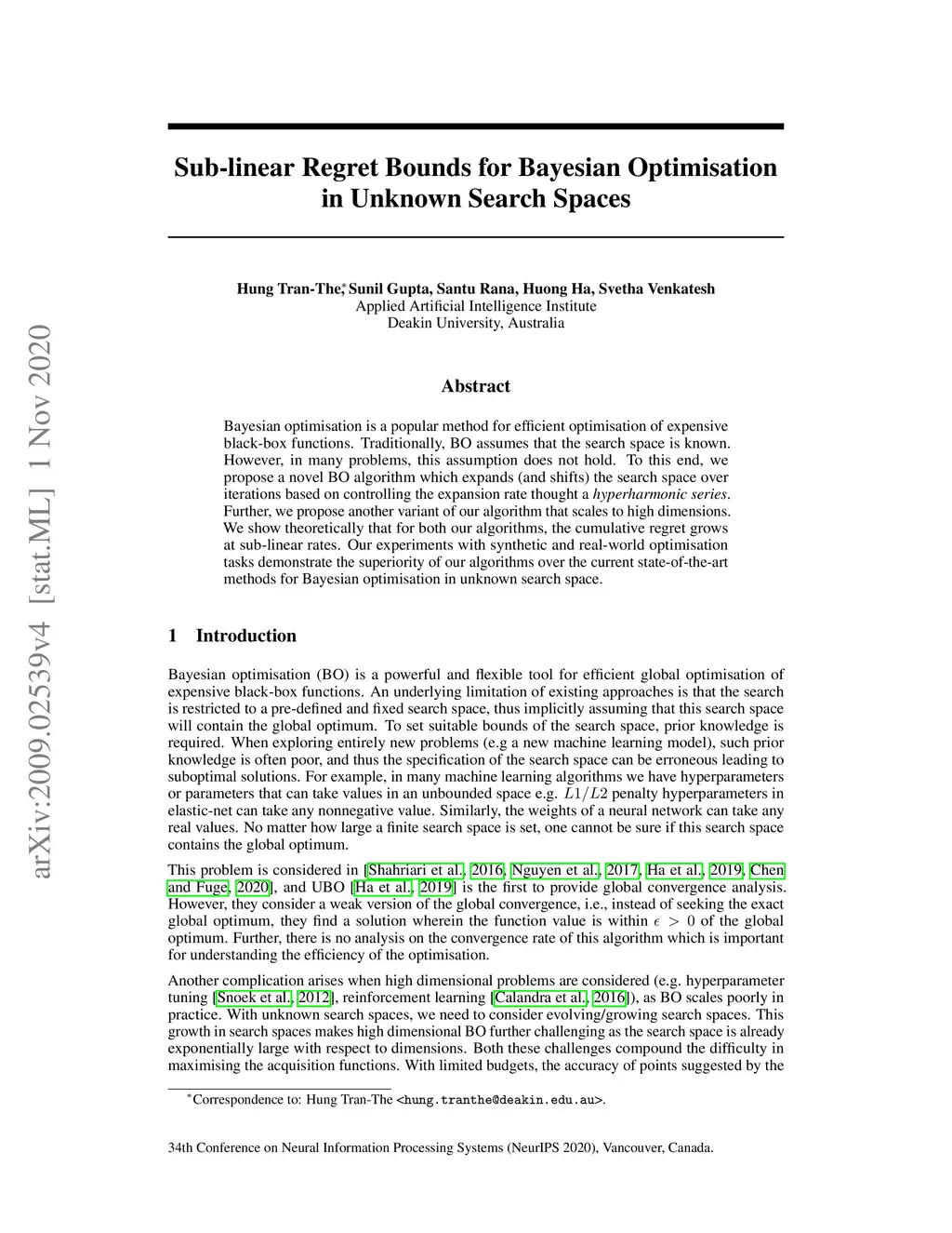 Bayesian optimisation is a popular method for efficient optimisation of expensive black-box functions. Traditionally, BO assumes that the search space is known. However, in many problems, this assumption does not hold. To this end, we propose a novel BO algorithm which expands (and shifts) the search space over iterations based on controlling the expansion rate thought a hyperharmonic series. Further, we propose another variant of our algorithm that scales to high dimensions. We show theoretically that for both our algorithms, the cumulative regret grows at sub-linear rates. Our experiments with synthetic and real-world optimisation tasks demonstrate the superiority of our algorithms over the current state-of-the-art methods for Bayesian optimisation in unknown search space.