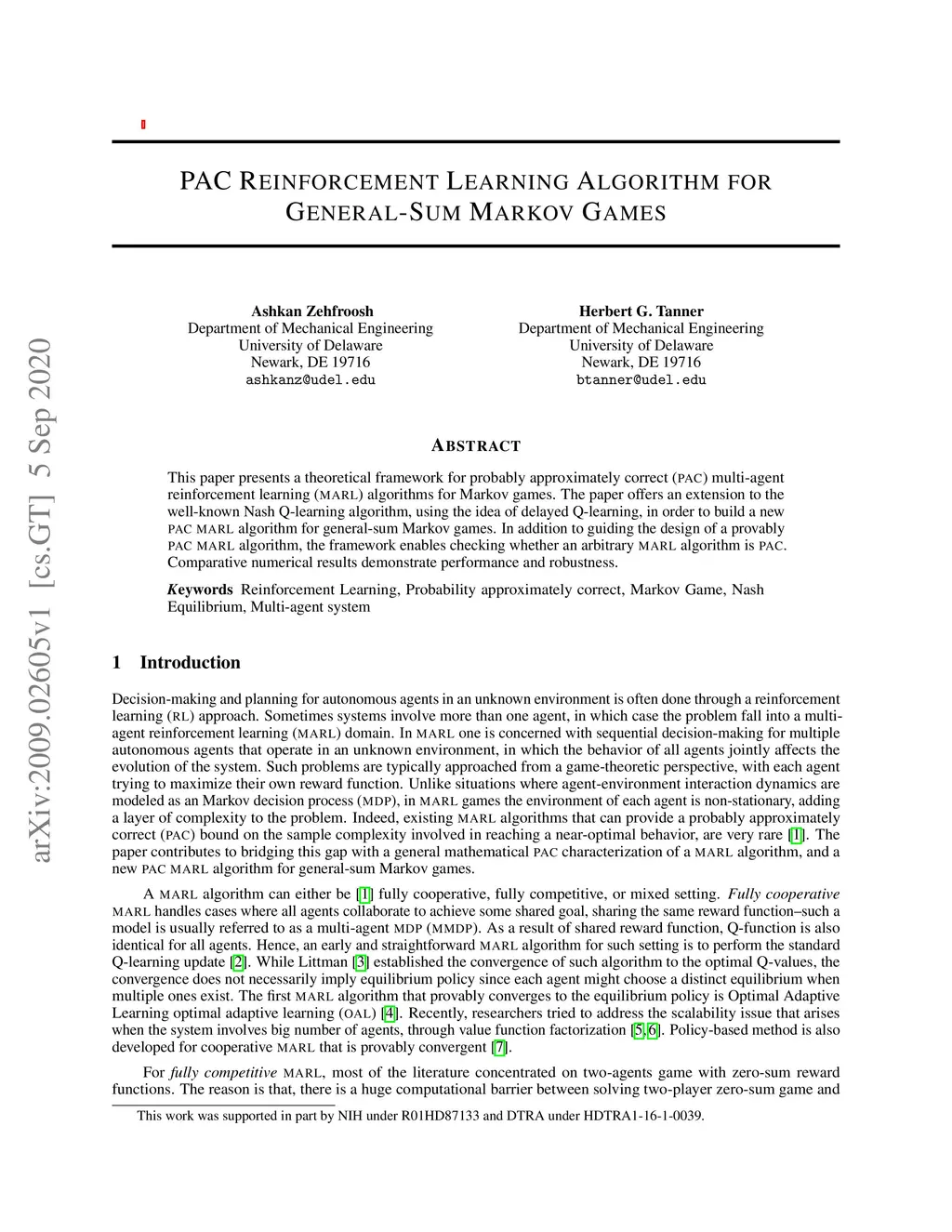 This paper presents a theoretical framework for probably approximately correct (PAC) multi-agent reinforcement learning (MARL) algorithms for Markov games. The paper offers an extension to the well-known Nash Q-learning algorithm, using the idea of delayed Q-learning, in order to build a new PAC MARL algorithm for general-sum Markov games. In addition to guiding the design of a provably PAC MARL algorithm, the framework enables checking whether an arbitrary MARL algorithm is PAC. Comparative numerical results demonstrate performance and robustness.