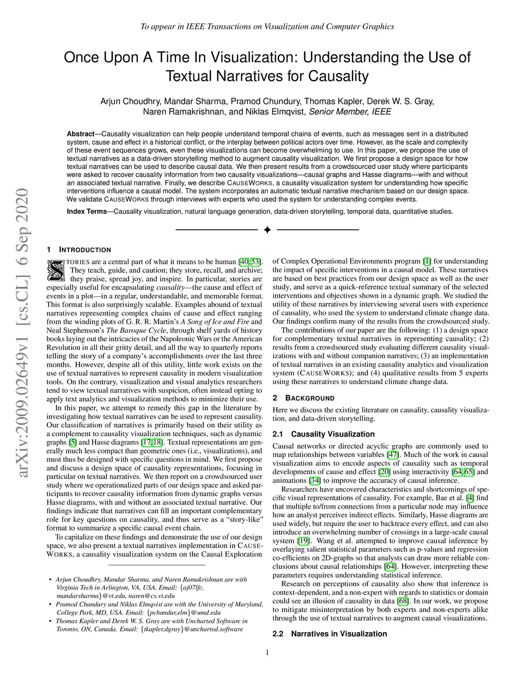 Causality visualization can help people understand temporal chains of events, such as messages sent in a distributed system, cause and effect in a historical conflict, or the interplay between political actors over time. However, as the scale and complexity of these event sequences grows, even these visualizations can become overwhelming to use. In this paper, we propose the use of textual narratives as a data-driven storytelling method to augment causality visualization. We first propose a design space for how textual narratives can be used to describe causal data. We then present results from a crowdsourced user study where participants were asked to recover causality information from two causality visualizations--causal graphs and Hasse diagrams--with and without an associated textual narrative. Finally, we describe CAUSEWORKS, a causality visualization system for understanding how specific interventions influence a causal model. The system incorporates an automatic textual narrative mechanism based on our design space. We validate CAUSEWORKS through interviews with experts who used the system for understanding complex events.