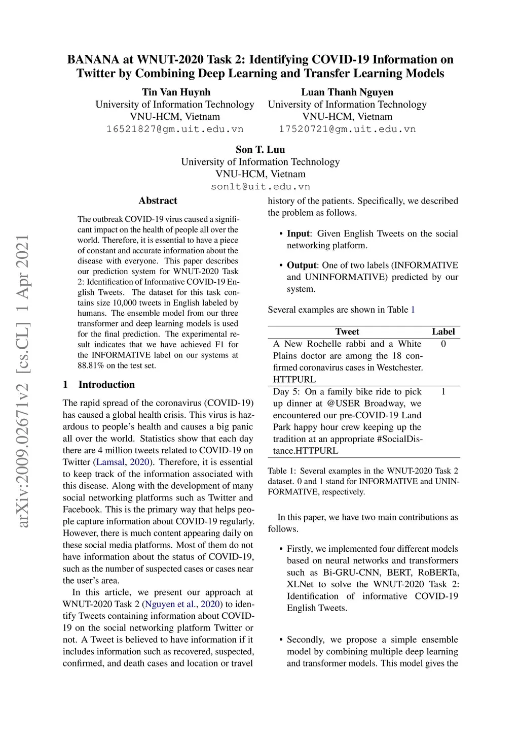 BANANA at WNUT-2020 Task 2: Identifying COVID-19 Information on Twitter