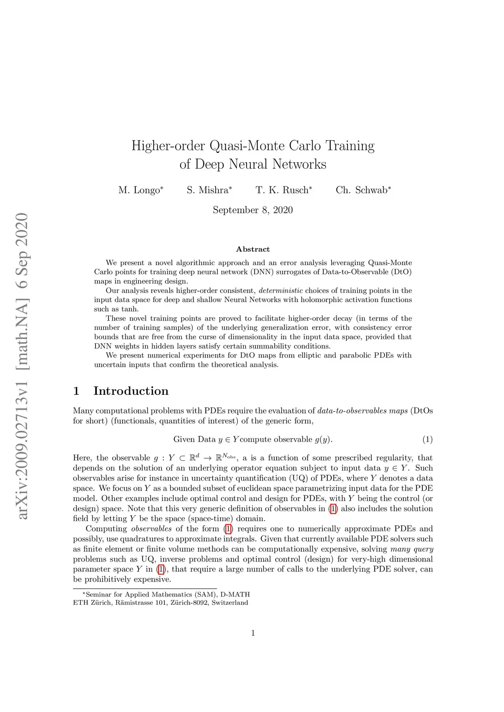 We present a novel algorithmic approach and an error analysis leveraging Quasi-Monte Carlo points for training deep neural network (DNN) surrogates of Data-to-Observable (DtO) maps in engineering design. Our analysis reveals higher-order consistent, deterministic choices of training points in the input data space for deep and shallow Neural Networks with holomorphic activation functions such as tanh. These novel training points are proved to facilitate higher-order decay (in terms of the number of training samples) of the underlying generalization error, with consistency error bounds that are free from the curse of dimensionality in the input data space, provided that DNN weights in hidden layers satisfy certain summability conditions. We present numerical experiments for DtO maps from elliptic and parabolic PDEs with uncertain inputs that confirm the theoretical analysis.