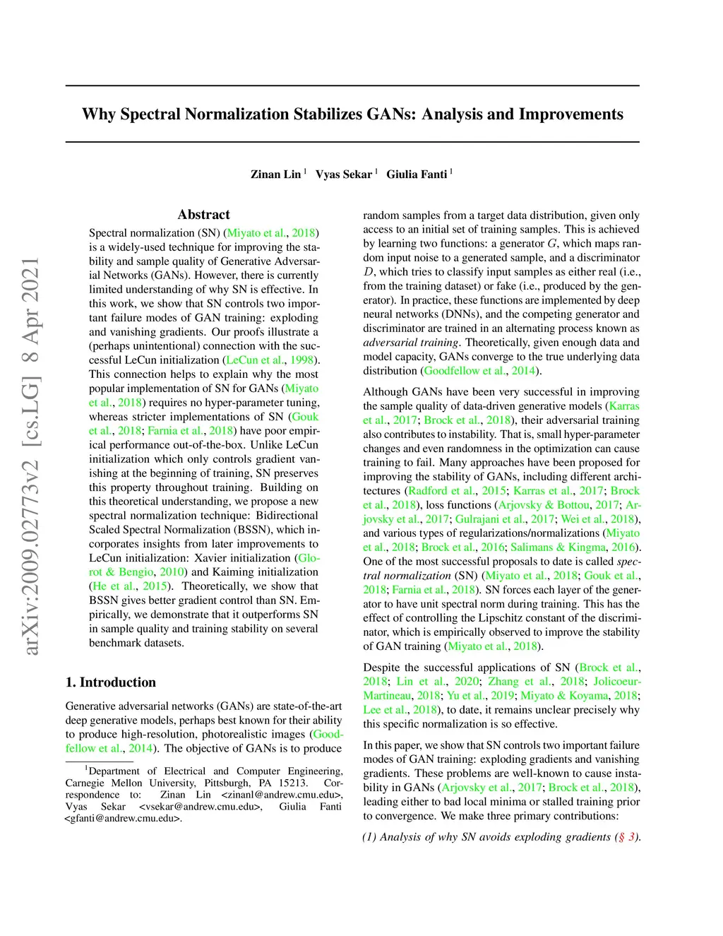 Spectral normalization (SN) is a widely-used technique for improving the stability and sample quality of Generative Adversarial Networks (GANs). However, there is currently limited understanding of why SN is effective. In this work, we show that SN controls two important failure modes of GAN training: exploding and vanishing gradients. Our proofs illustrate a (perhaps unintentional) connection with the successful LeCun initialization. This connection helps to explain why the most popular implementation of SN for GANs requires no hyper-parameter tuning, whereas stricter implementations of SN have poor empirical performance out-of-the-box. Unlike LeCun initialization which only controls gradient vanishing at the beginning of training, SN preserves this property throughout training. Building on this theoretical understanding, we propose a new spectral normalization technique: Bidirectional Scaled Spectral Normalization (BSSN), which incorporates insights from later improvements to LeCun initialization: Xavier initialization and Kaiming initialization. Theoretically, we show that BSSN gives better gradient control than SN. Empirically, we demonstrate that it outperforms SN in sample quality and training stability on several benchmark datasets.