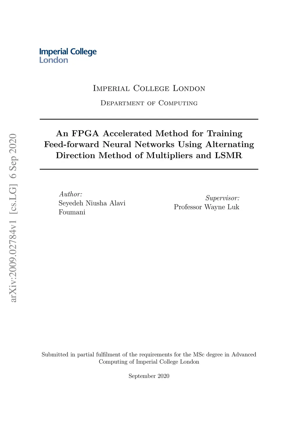 In this project, we have successfully designed, implemented, deployed and tested a novel FPGA accelerated algorithm for neural network training. The algorithm itself was developed in an independent study option. This training method is based on Alternating Direction Method of Multipliers algorithm, which has strong parallel characteristics and avoids procedures such as matrix inversion that are problematic in hardware designs by employing LSMR. As an intermediate stage, we fully implemented the ADMM-LSMR method in C language for feed-forward neural networks with a flexible number of layers and hidden size. We demonstrated that the method can operate with fixed-point arithmetic without compromising the accuracy. Next, we devised an FPGA accelerated version of the algorithm using Intel FPGA SDK for OpenCL and performed extensive optimisation stages followed by successful deployment of the program on an Intel Arria 10 GX FPGA. The FPGA accelerated program showed up to 6 times speed up comparing to equivalent CPU implementation while achieving promising accuracy.