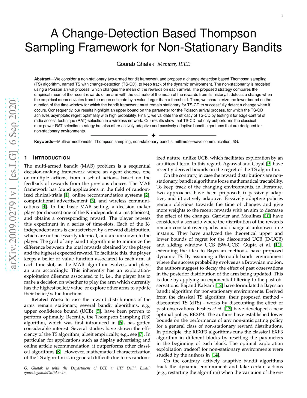 We consider a non-stationary two-armed bandit framework and propose a change-detection based Thompson sampling (TS) algorithm, named TS with change-detection (TS-CD), to keep track of the dynamic environment. The non-stationarity is modeled using a Poisson arrival process, which changes the mean of the rewards on each arrival. The proposed strategy compares the empirical mean of the recent rewards of an arm with the estimate of the mean of the rewards from its history. It detects a change when the empirical mean deviates from the mean estimate by a value larger than a threshold. Then, we characterize the lower bound on the duration of the time-window for which the bandit framework must remain stationary for TS-CD to successfully detect a change when it occurs. Consequently, our results highlight an upper bound on the parameter for the Poisson arrival process, for which the TS-CD achieves asymptotic regret optimality with high probability. Finally, we validate the efficacy of TS-CD by testing it for edge-control of radio access technique (RAT)-selection in a wireless network. Our results show that TS-CD not only outperforms the classical max-power RAT selection strategy but also other actively adaptive and passively adaptive bandit algorithms that are designed for non-stationary environments.