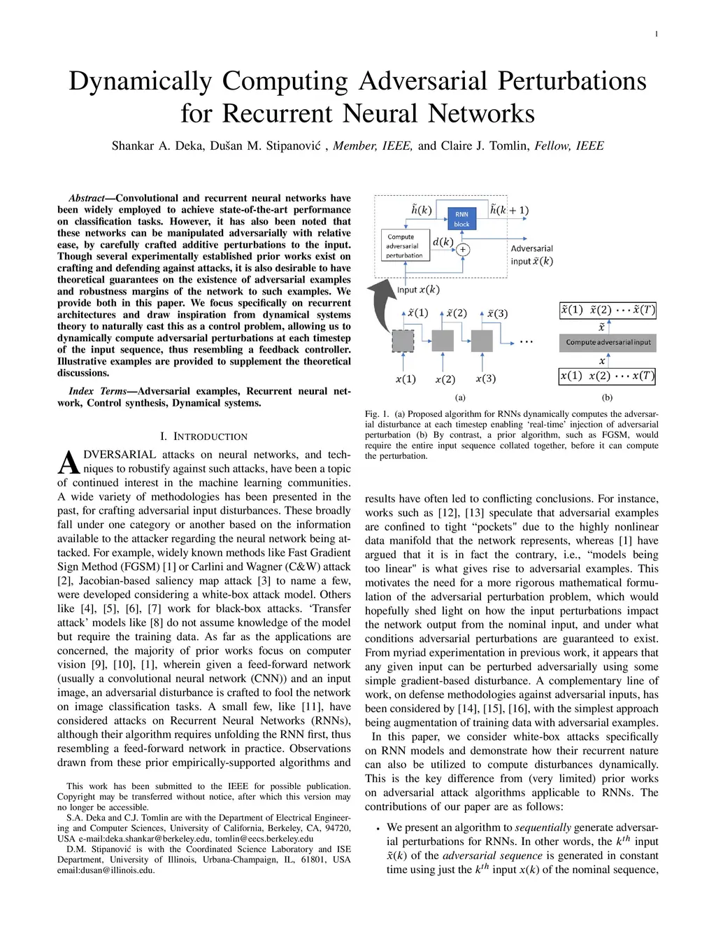 Convolutional and recurrent neural networks have been widely employed to achieve state-of-the-art performance on classification tasks. However, it has also been noted that these networks can be manipulated adversarially with relative ease, by carefully crafted additive perturbations to the input. Though several experimentally established prior works exist on crafting and defending against attacks, it is also desirable to have theoretical guarantees on the existence of adversarial examples and robustness margins of the network to such examples. We provide both in this paper. We focus specifically on recurrent architectures and draw inspiration from dynamical systems theory to naturally cast this as a control problem, allowing us to dynamically compute adversarial perturbations at each timestep of the input sequence, thus resembling a feedback controller. Illustrative examples are provided to supplement the theoretical discussions.