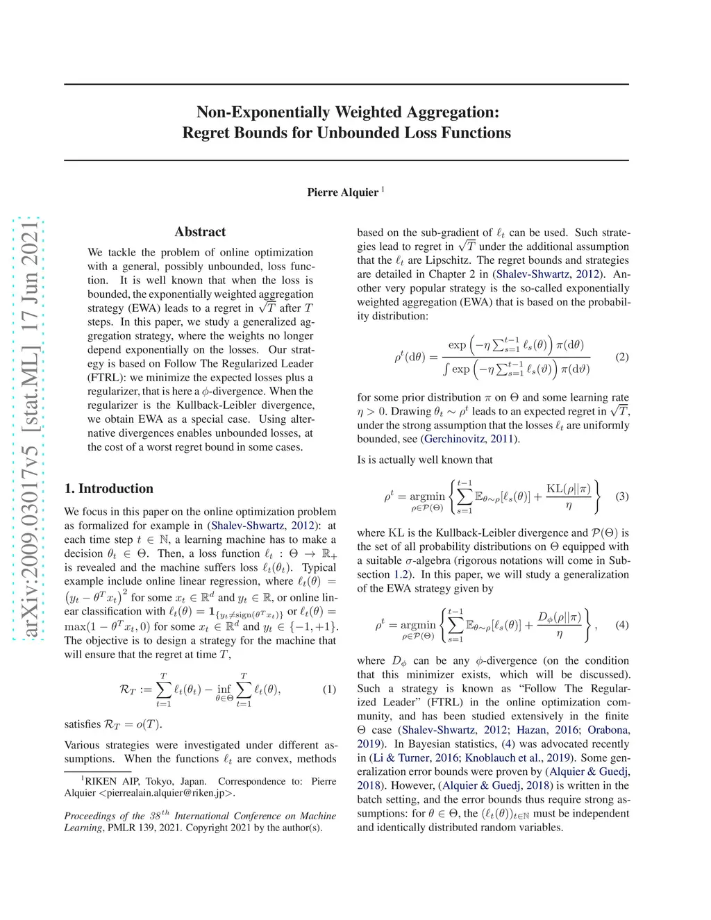 We tackle the problem of online optimization with a general, possibly unbounded, loss function. It is well known that when the loss is bounded, the exponentially weighted aggregation strategy (EWA) leads to a regret in after steps. In this paper, we study a generalized aggregation strategy, where the weights no longer depend exponentially on the losses. Our strategy is based on Follow The Regularized Leader (FTRL): we minimize the expected losses plus a regularizer, that is here a -divergence. When the regularizer is the Kullback-Leibler divergence, we obtain EWA as a special case. Using alternative divergences enables unbounded losses, at the cost of a worst regret bound in some cases.