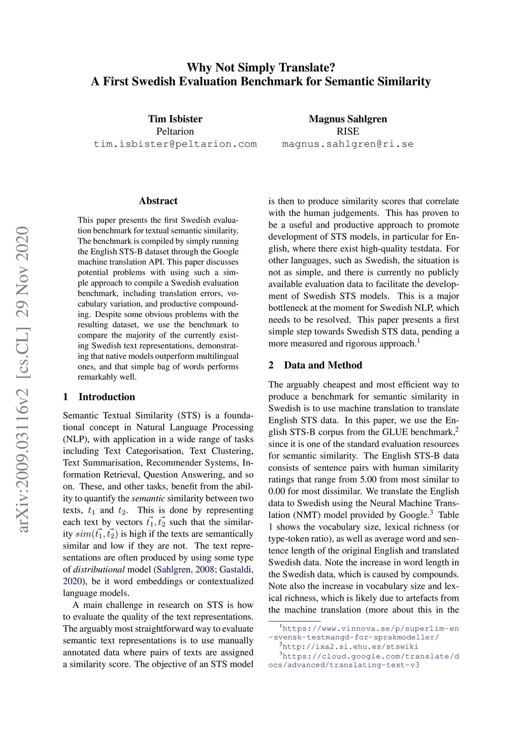 This paper presents the first Swedish evaluation benchmark for textual semantic similarity. The benchmark is compiled by simply running the English STS-B dataset through the Google machine translation API. This paper discusses potential problems with using such a simple approach to compile a Swedish evaluation benchmark, including translation errors, vocabulary variation, and productive compounding. Despite some obvious problems with the resulting dataset, we use the benchmark to compare the majority of the currently existing Swedish text representations, demonstrating that native models outperform multilingual ones, and that simple bag of words performs remarkably well.