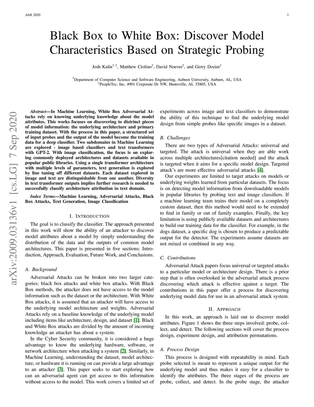 In Machine Learning, White Box Adversarial Attacks rely on knowing underlying knowledge about the model attributes. This works focuses on discovering to distrinct pieces of model information: the underlying architecture and primary training dataset. With the process in this paper, a structured set of input probes and the output of the model become the training data for a deep classifier. Two subdomains in Machine Learning are explored: image based classifiers and text transformers with GPT-2. With image classification, the focus is on exploring commonly deployed architectures and datasets available in popular public libraries. Using a single transformer architecture with multiple levels of parameters, text generation is explored by fine tuning off different datasets. Each dataset explored in image and text are distinguishable from one another. Diversity in text transformer outputs implies further research is needed to successfully classify architecture attribution in text domain.