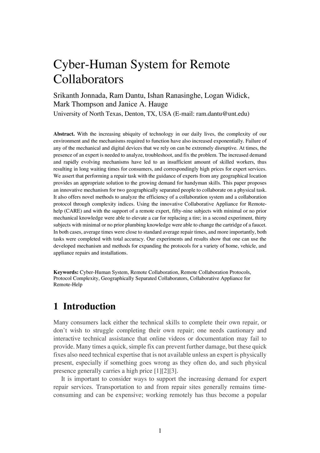 With the increasing ubiquity of technology in our daily lives, the complexity of our environment and the mechanisms required to function have also increased exponentially. Failure of any of the mechanical and digital devices that we rely on can be extremely disruptive. At times, the presence of an expert is needed to analyze, troubleshoot, and fix the problem. The increased demand and rapidly evolving mechanisms have led to an insufficient amount of skilled workers, thus resulting in long waiting times for consumers, and correspondingly high prices for expert services. We assert that performing a repair task with the guidance of experts from any geographical location provides an appropriate solution to the growing demand for handyman skills. This paper proposes an innovative mechanism for two geographically separated people to collaborate on a physical task. It also offers novel methods to analyze the efficiency of a collaboration system and a collaboration protocol through complexity indices. Using the innovative Collaborative Appliance for Remote-help (CARE) and with the support of a remote expert, fifty-nine subjects with minimal or no prior mechanical knowledge were able to elevate a car for replacing a tire; in a second experiment, thirty subjects with minimal or no prior plumbing knowledge were able to change the cartridge of a faucet. In both cases, average times were close to standard average repair times, and more importantly, both tasks were completed with total accuracy. Our experiments and results show that one can use the developed mechanism and methods for expanding the protocols for a variety of home, vehicle, and appliance repairs and installations.
