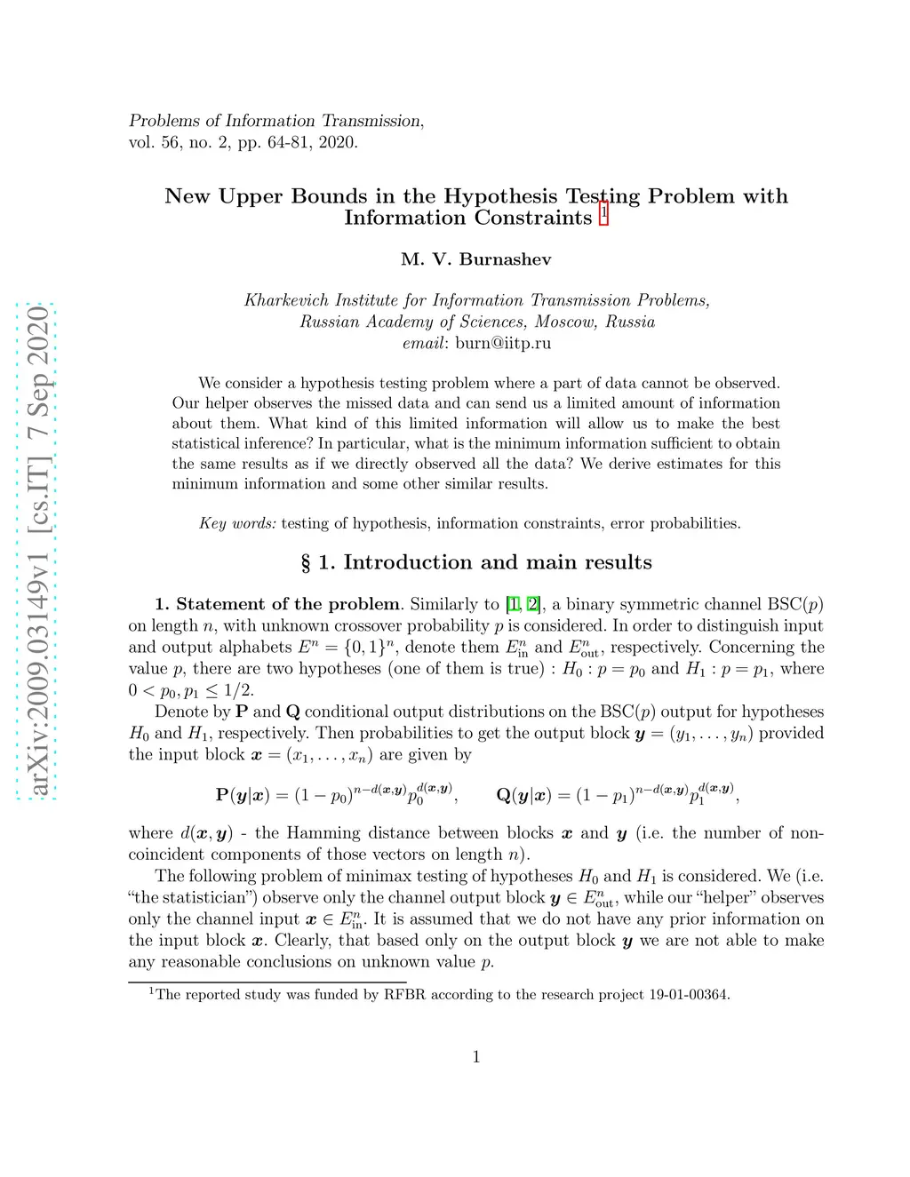 New Upper Bounds in the Hypothesis Testing Problem with Information