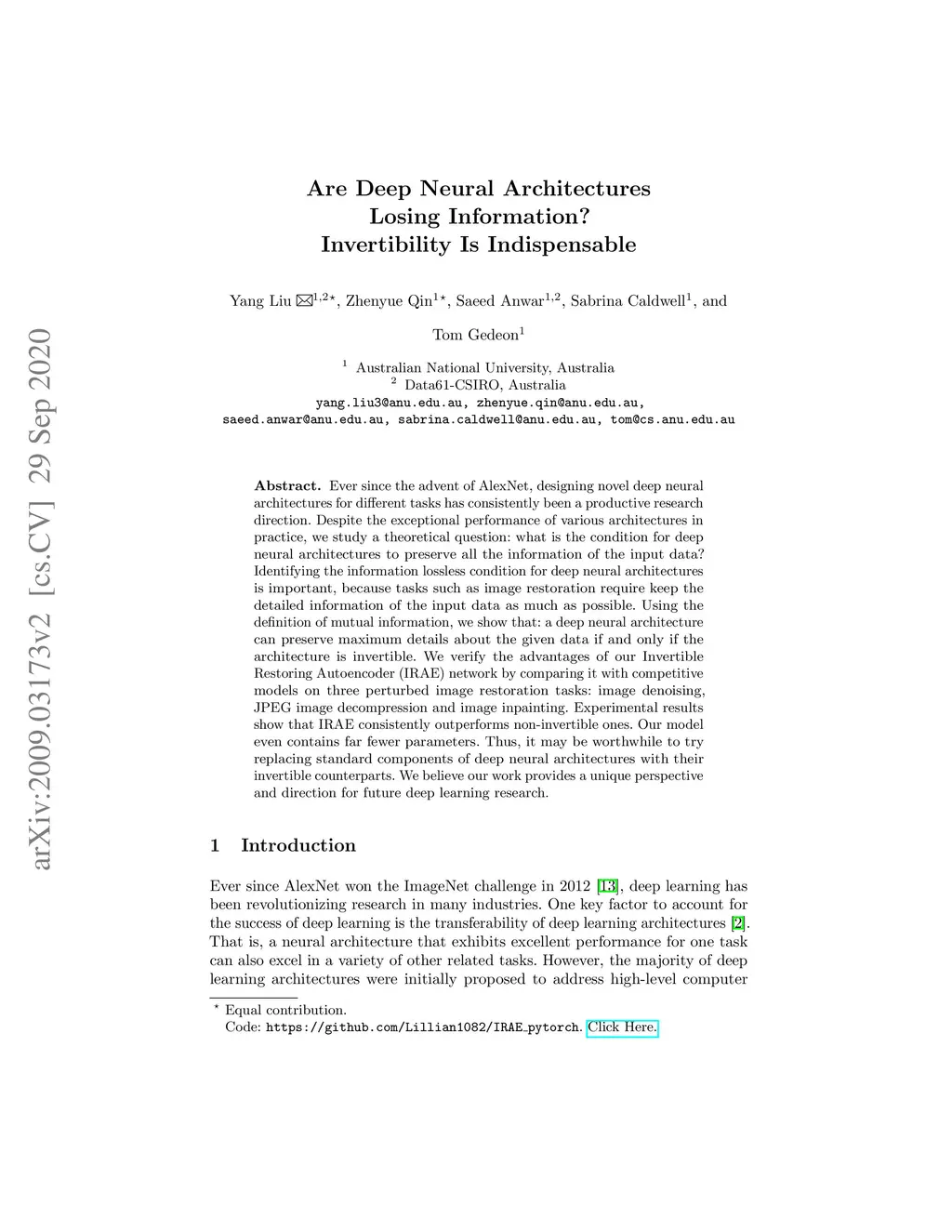 Ever since the advent of AlexNet, designing novel deep neural architectures for different tasks has consistently been a productive research direction. Despite the exceptional performance of various architectures in practice, we study a theoretical question: what is the condition for deep neural architectures to preserve all the information of the input data? Identifying the information lossless condition for deep neural architectures is important, because tasks such as image restoration require keep the detailed information of the input data as much as possible. Using the definition of mutual information, we show that: a deep neural architecture can preserve maximum details about the given data if and only if the architecture is invertible. We verify the advantages of our Invertible Restoring Autoencoder (IRAE) network by comparing it with competitive models on three perturbed image restoration tasks: image denoising, jpeg image decompression and image inpainting. Experimental results show that IRAE consistently outperforms non-invertible ones. Our model even contains far fewer parameters. Thus, it may be worthwhile to try replacing standard components of deep neural architectures, such as residual blocks and ReLU, with their invertible counterparts. We believe our work provides a unique perspective and direction for future deep learning research.