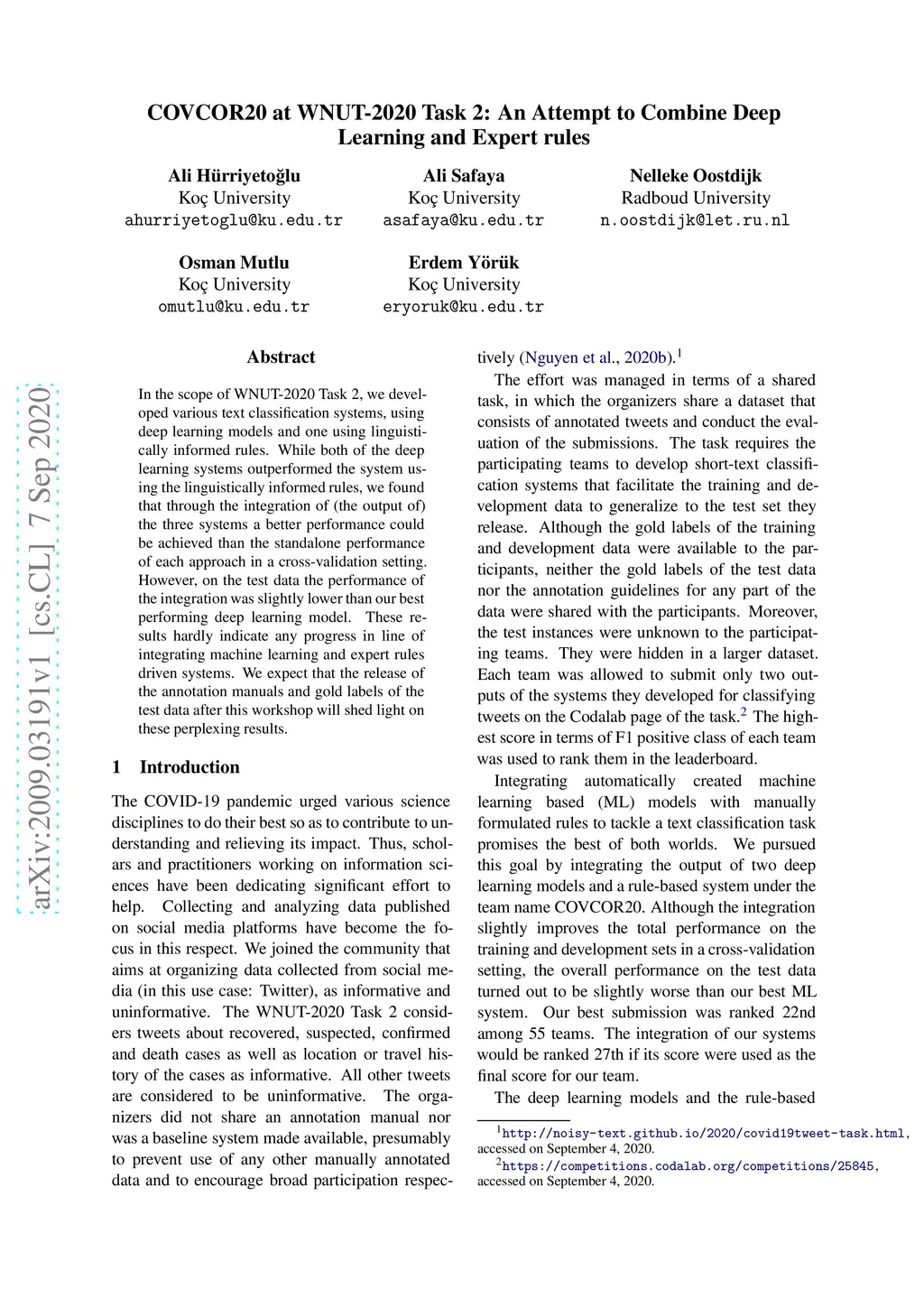 COVCOR20 at WNUT-2020 Task 2: An Attempt to Combine Deep Learning and