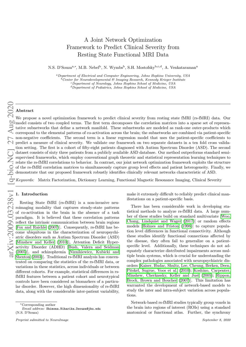 We propose a novel optimization framework to predict clinical severity from resting state fMRI (rs-fMRI) data. Our model consists of two coupled terms. The first term decomposes the correlation matrices into a sparse set of representative subnetworks that define a network manifold. These subnetworks are modeled as rank-one outer-products which correspond to the elemental patterns of co-activation across the brain; the subnetworks are combined via patient-specific non-negative coefficients. The second term is a linear regression model that uses the patient-specific coefficients to predict a measure of clinical severity. We validate our framework on two separate datasets in a ten fold cross validation setting. The first is a cohort of fifty-eight patients diagnosed with Autism Spectrum Disorder (ASD). The second dataset consists of sixty three patients from a publicly available ASD database. Our method outperforms standard semi-supervised frameworks, which employ conventional graph theoretic and statistical representation learning techniques to relate the rs-fMRI correlations to behavior. In contrast, our joint network optimization framework exploits the structure of the rs-fMRI correlation matrices to simultaneously capture group level effects and patient heterogeneity. Finally, we demonstrate that our proposed framework robustly identifies clinically relevant networks characteristic of ASD.