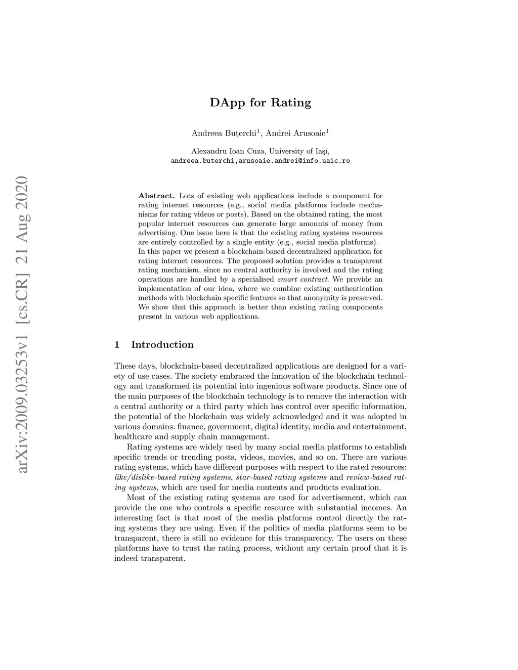 Lots of existing web applications include a component for rating internet resources (e.g., social media platforms include mechanisms for rating videos or posts). Based on the obtained rating, the most popular internet resources can generate large amounts of money from advertising. One issue here is that the existing rating systems resources are entirely controlled by a single entity (e.g., social media platforms). In this paper we present a blockchain-based decentralized application for rating internet resources. The proposed solution provides a transparent rating mechanism, since no central authority is involved and the rating operations are handled by a specialised smart contract. We provide an implementation of our idea, where we combine existing authentication methods with blockchain specific features so that anonymity is preserved. We show that this approach is better than existing rating components present in various web applications.