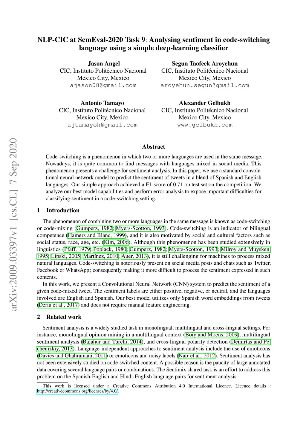 NLP-CIC at SemEval-2020 Task 9: Analysing sentiment in code-switching