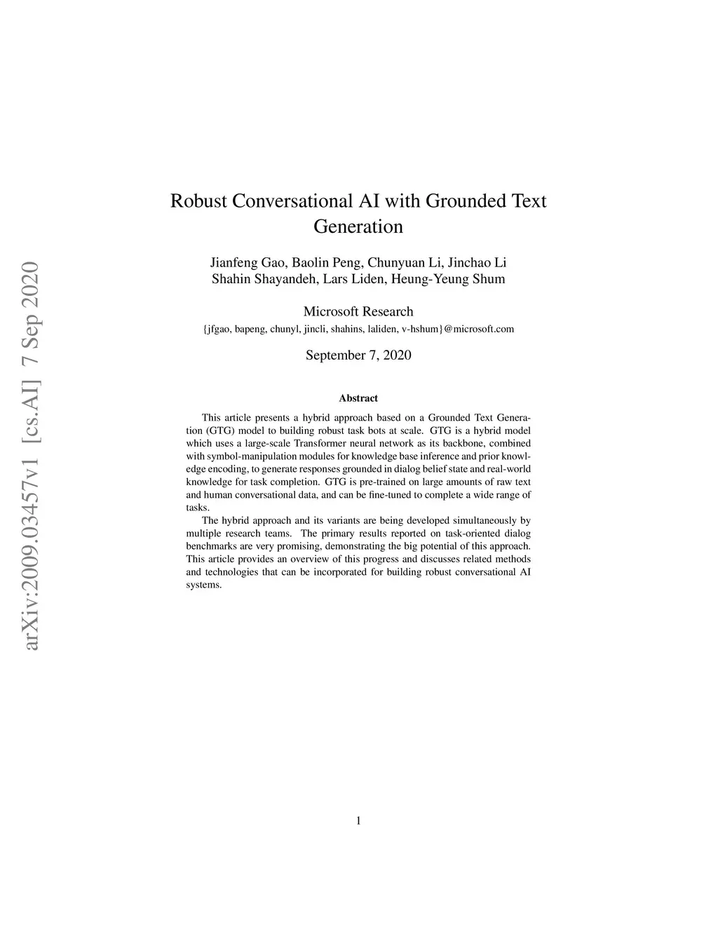 This article presents a hybrid approach based on a Grounded Text Generation (GTG) model to building robust task bots at scale. GTG is a hybrid model which uses a large-scale Transformer neural network as its backbone, combined with symbol-manipulation modules for knowledge base inference and prior knowledge encoding, to generate responses grounded in dialog belief state and real-world knowledge for task completion. GTG is pre-trained on large amounts of raw text and human conversational data, and can be fine-tuned to complete a wide range of tasks. The hybrid approach and its variants are being developed simultaneously by multiple research teams. The primary results reported on task-oriented dialog benchmarks are very promising, demonstrating the big potential of this approach. This article provides an overview of this progress and discusses related methods and technologies that can be incorporated for building robust conversational AI systems.