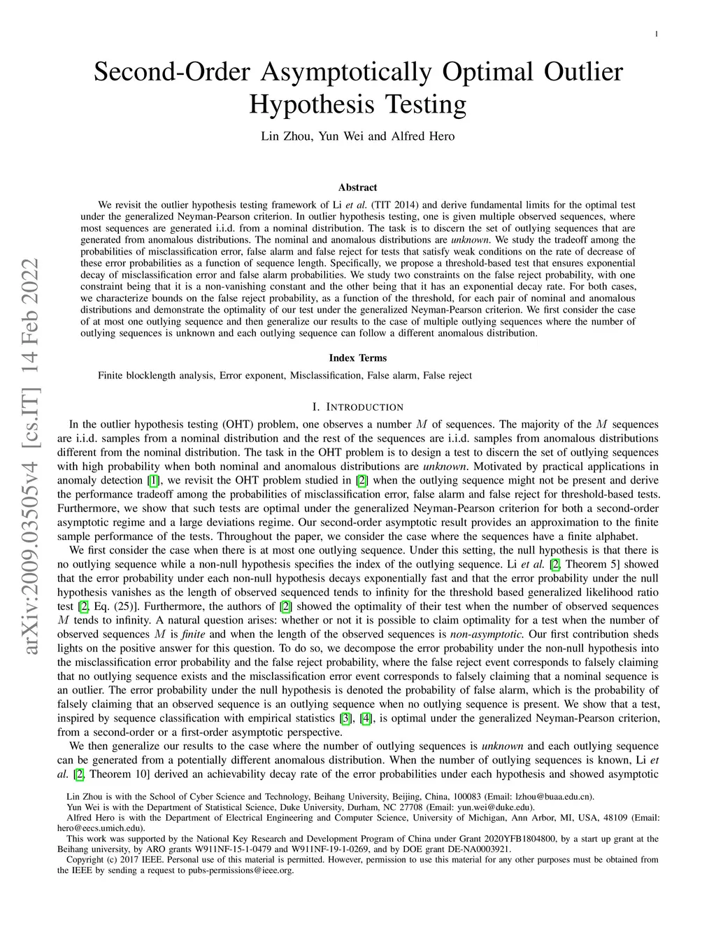 We revisit the outlier hypothesis testing framework of Li \emph{et al.} (TIT 2014) and derive fundamental limits for the optimal test under the generalized Neyman-Pearson criterion. In outlier hypothesis testing, one is given multiple observed sequences, where most sequences are generated i.i.d. from a nominal distribution. The task is to discern the set of outlying sequences that are generated from anomalous distributions. The nominal and anomalous distributions are \emph{unknown}. We study the tradeoff among the probabilities of misclassification error, false alarm and false reject for tests that satisfy weak conditions on the rate of decrease of these error probabilities as a function of sequence length. Specifically, we propose a threshold-based test that ensures exponential decay of misclassification error and false alarm probabilities. We study two constraints on the false reject probability, with one constraint being that it is a non-vanishing constant and the other being that it has an exponential decay rate. For both cases, we characterize bounds on the false reject probability, as a function of the threshold, for each pair of nominal and anomalous distributions and demonstrate the optimality of our test under the generalized Neyman-Pearson criterion. We first consider the case of at most one outlying sequence and then generalize our results to the case of multiple outlying sequences where the number of outlying sequences is unknown and each outlying sequence can follow a different anomalous distribution.