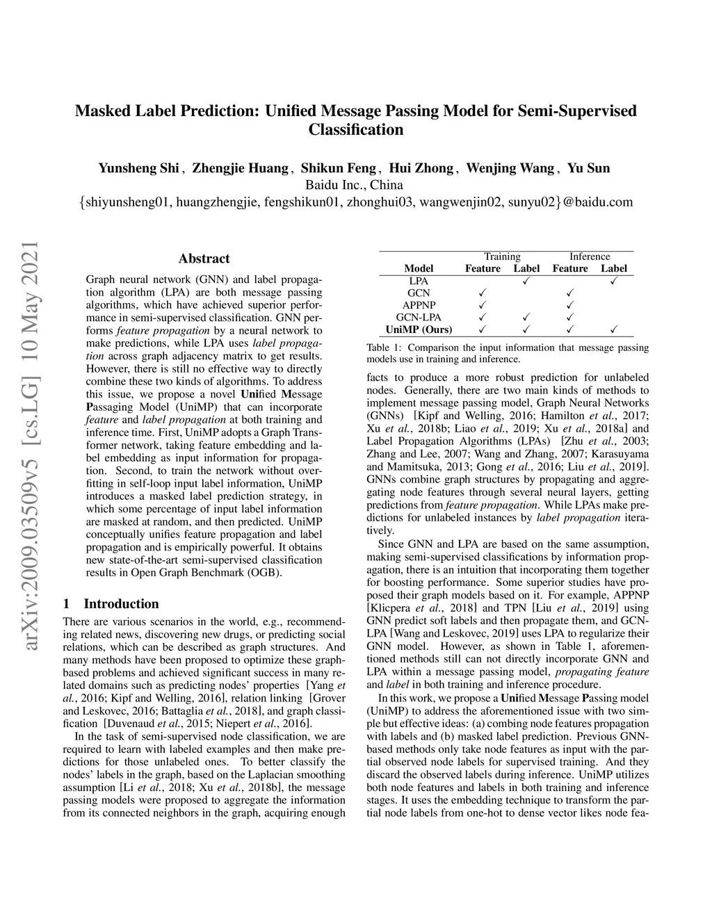 Graph neural network (GNN) and label propagation algorithm (LPA) are both message passing algorithms, which have achieved superior performance in semi-supervised classification. GNN performs feature propagation by a neural network to make predictions, while LPA uses label propagation across graph adjacency matrix to get results. However, there is still no effective way to directly combine these two kinds of algorithms. To address this issue, we propose a novel Unified Message Passaging Model (UniMP) that can incorporate feature and label propagation at both training and inference time. First, UniMP adopts a Graph Transformer network, taking feature embedding and label embedding as input information for propagation. Second, to train the network without overfitting in self-loop input label information, UniMP introduces a masked label prediction strategy, in which some percentage of input label information are masked at random, and then predicted. UniMP conceptually unifies feature propagation and label propagation and is empirically powerful. It obtains new state-of-the-art semi-supervised classification results in Open Graph Benchmark (OGB).