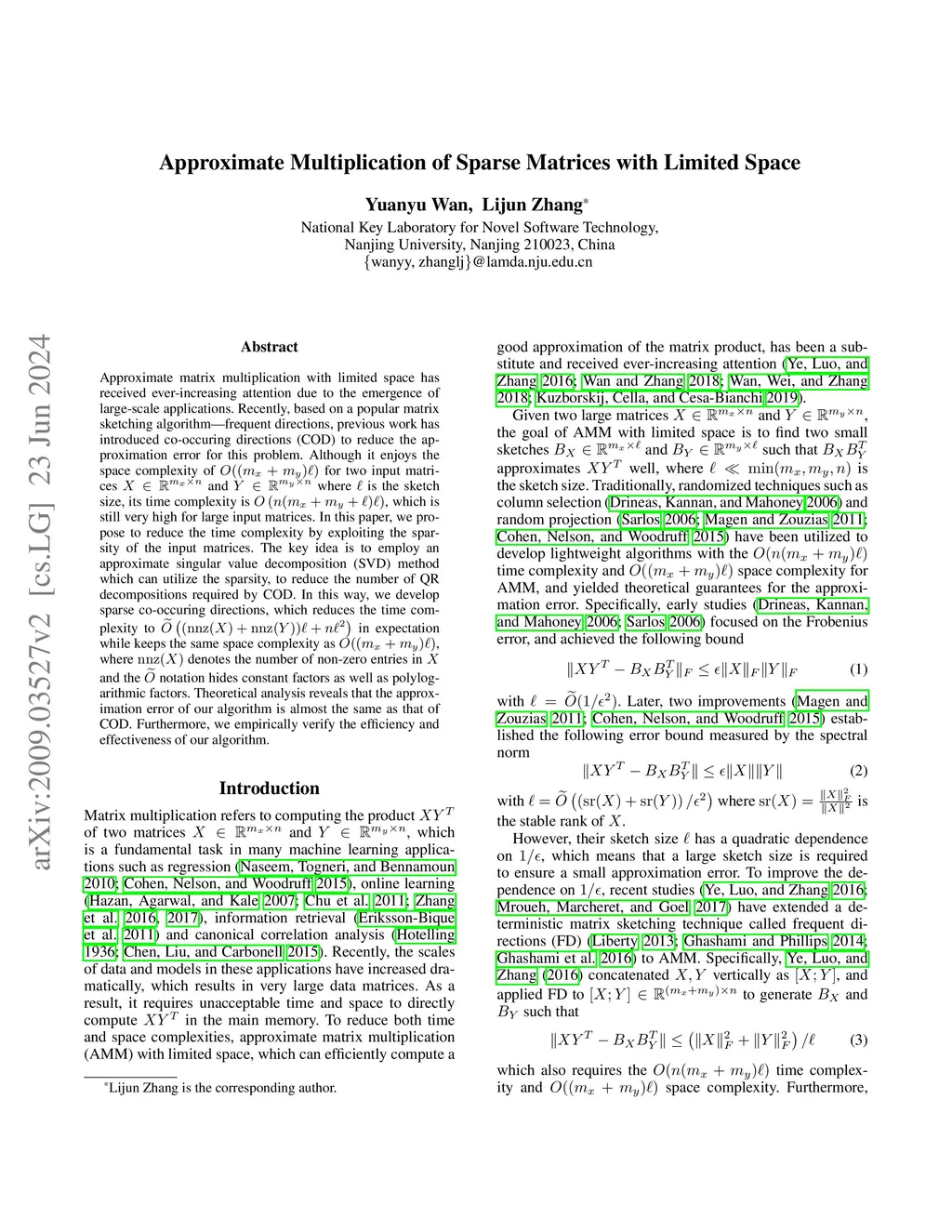 Approximate Multiplication of Sparse Matrices with Limited Space