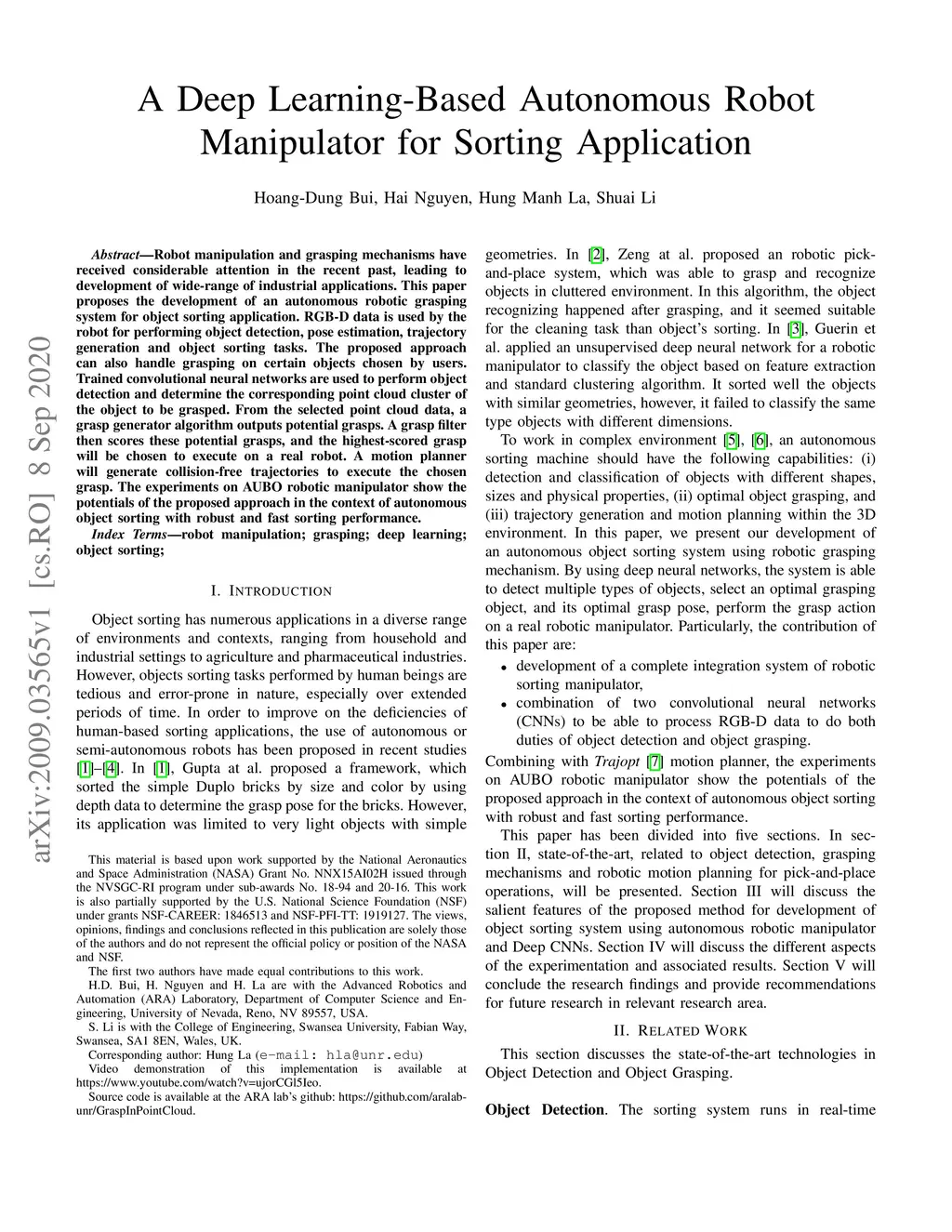 A Deep Learning-Based Autonomous RobotManipulator for Sorting
