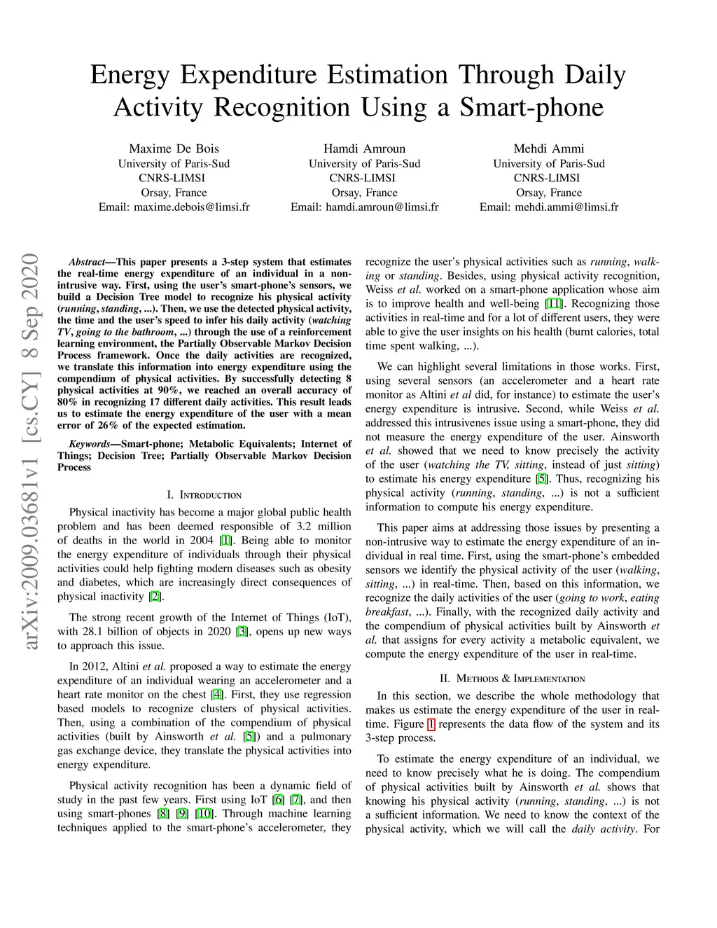 This paper presents a 3-step system that estimates the real-time energy expenditure of an individual in a non-intrusive way. First, using the user's smart-phone's sensors, we build a Decision Tree model to recognize his physical activity (\textit{running}, \textit{standing}, ...). Then, we use the detected physical activity, the time and the user's speed to infer his daily activity (\textit{watching TV}, \textit{going to the bathroom}, ...) through the use of a reinforcement learning environment, the Partially Observable Markov Decision Process framework. Once the daily activities are recognized, we translate this information into energy expenditure using the compendium of physical activities. By successfully detecting 8 physical activities at 90\%, we reached an overall accuracy of 80\% in recognizing 17 different daily activities. This result leads us to estimate the energy expenditure of the user with a mean error of 26\% of the expected estimation.